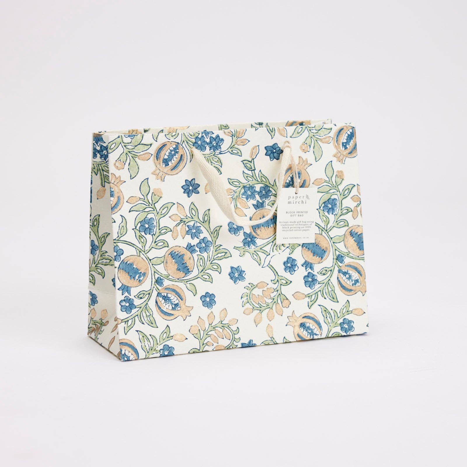 Our hand block printed gift bags are made from a strong 250gsm recycled cotton card paper in colours and designs complementing the gift wrap range.