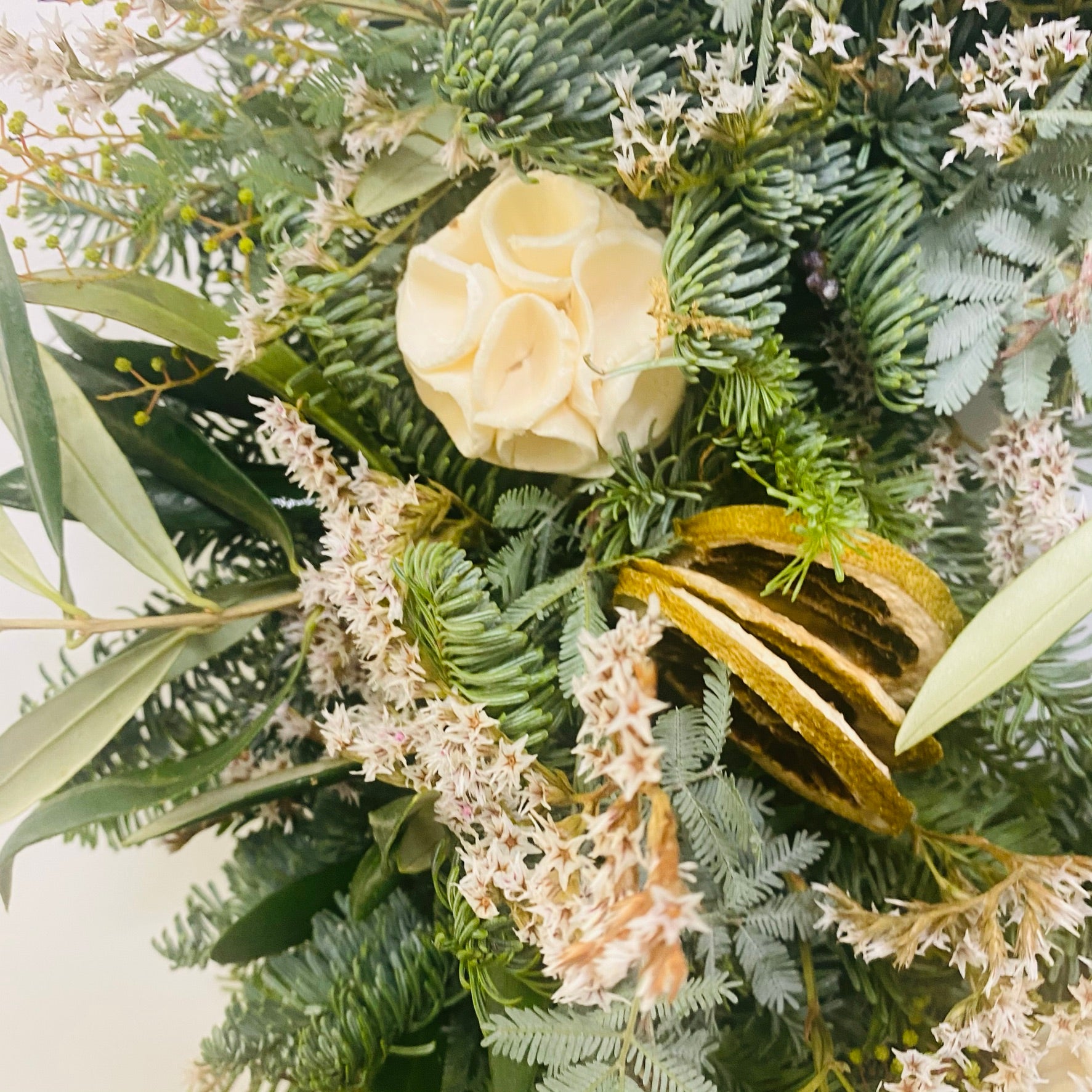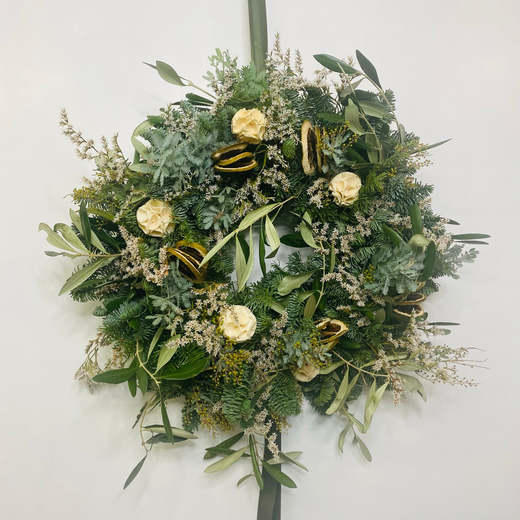 Our Enchanting evergreen wreath is made up of a mixture of Blue Pine, Olive, Mimosa, Limonium Dried limes, white berries, finish off with a Olive Green ribbon.