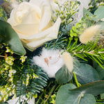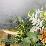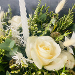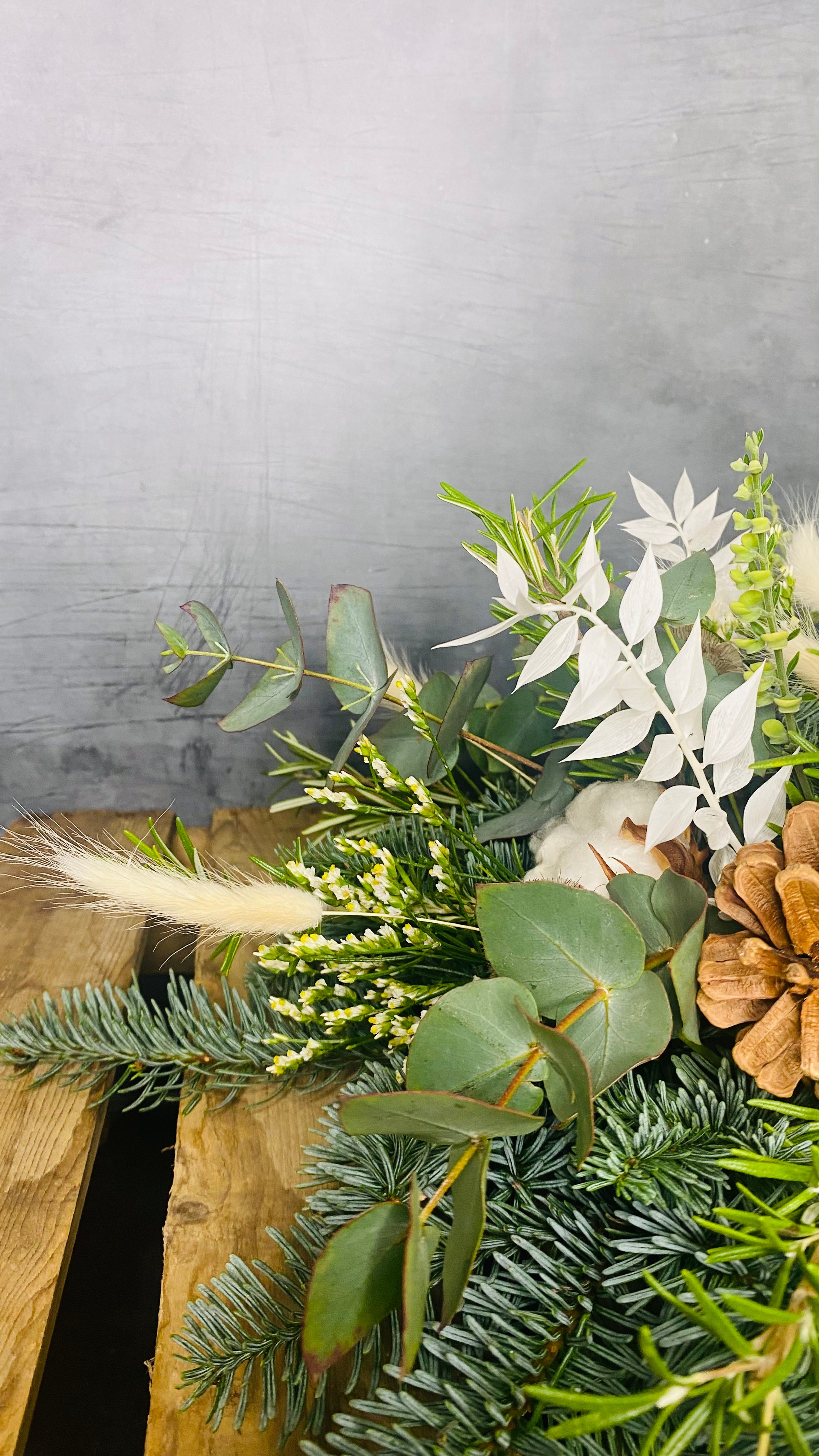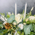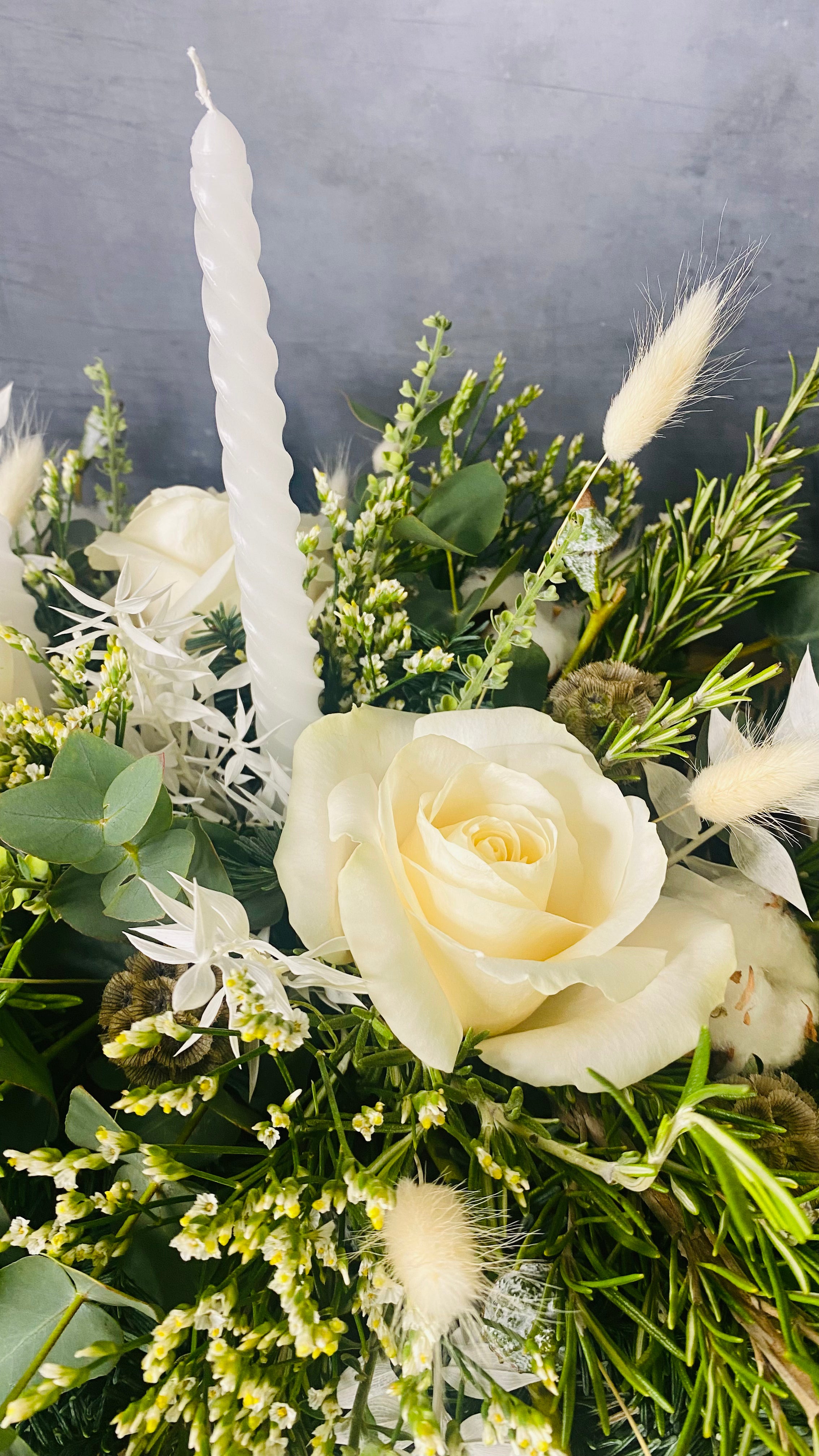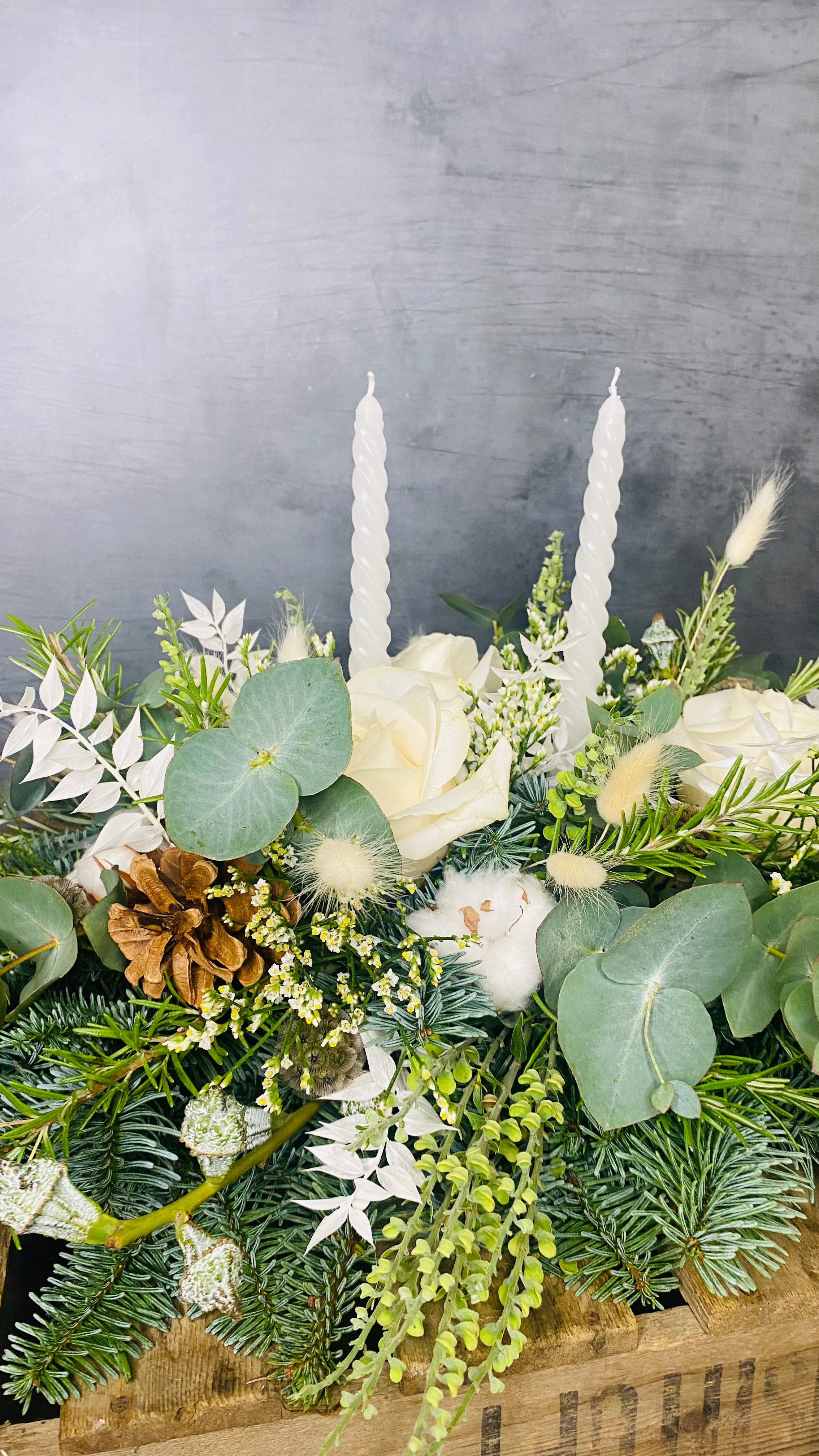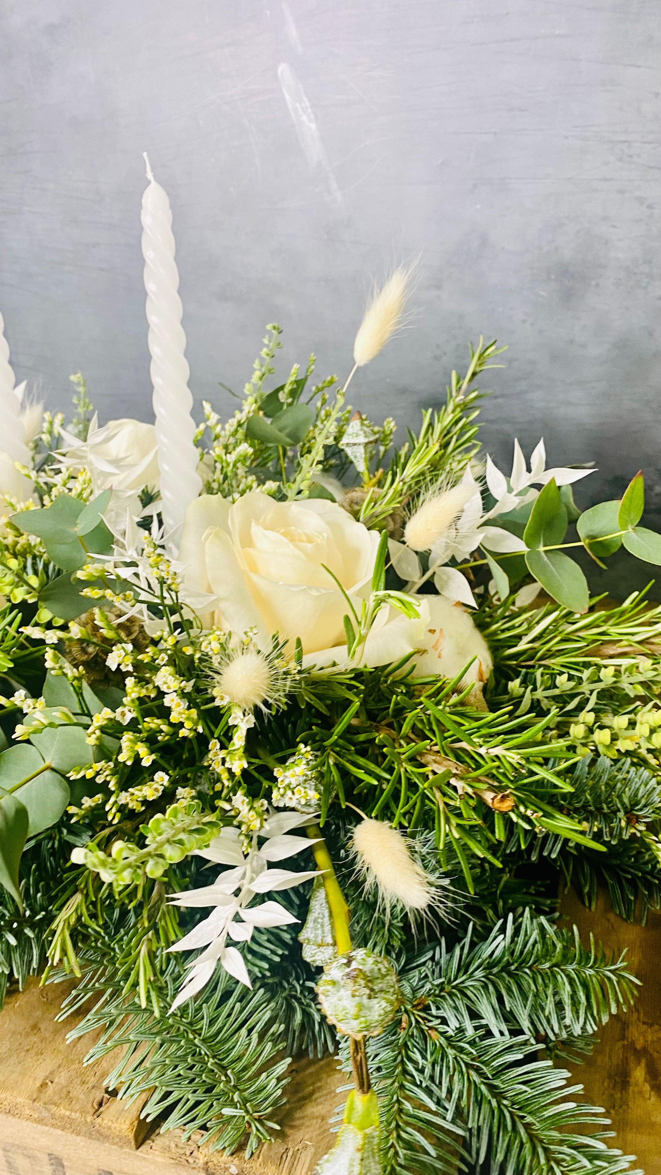 Let the centrepiece do the talking! Nordic spirit Featuring blue pine, white ruscus, pine cones, cotton, white bunny tails, white roses and other seasonal includes 2 taper candles.
