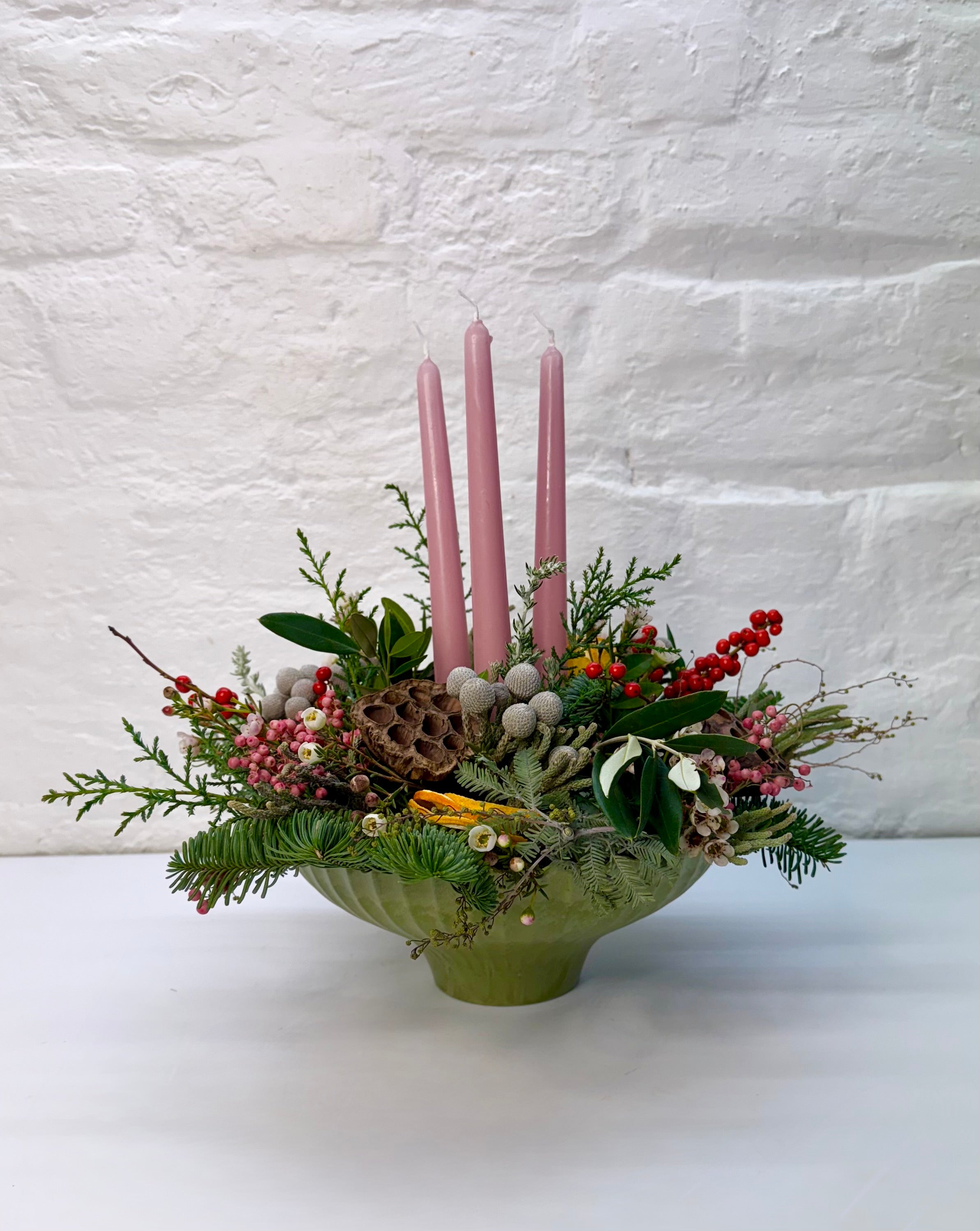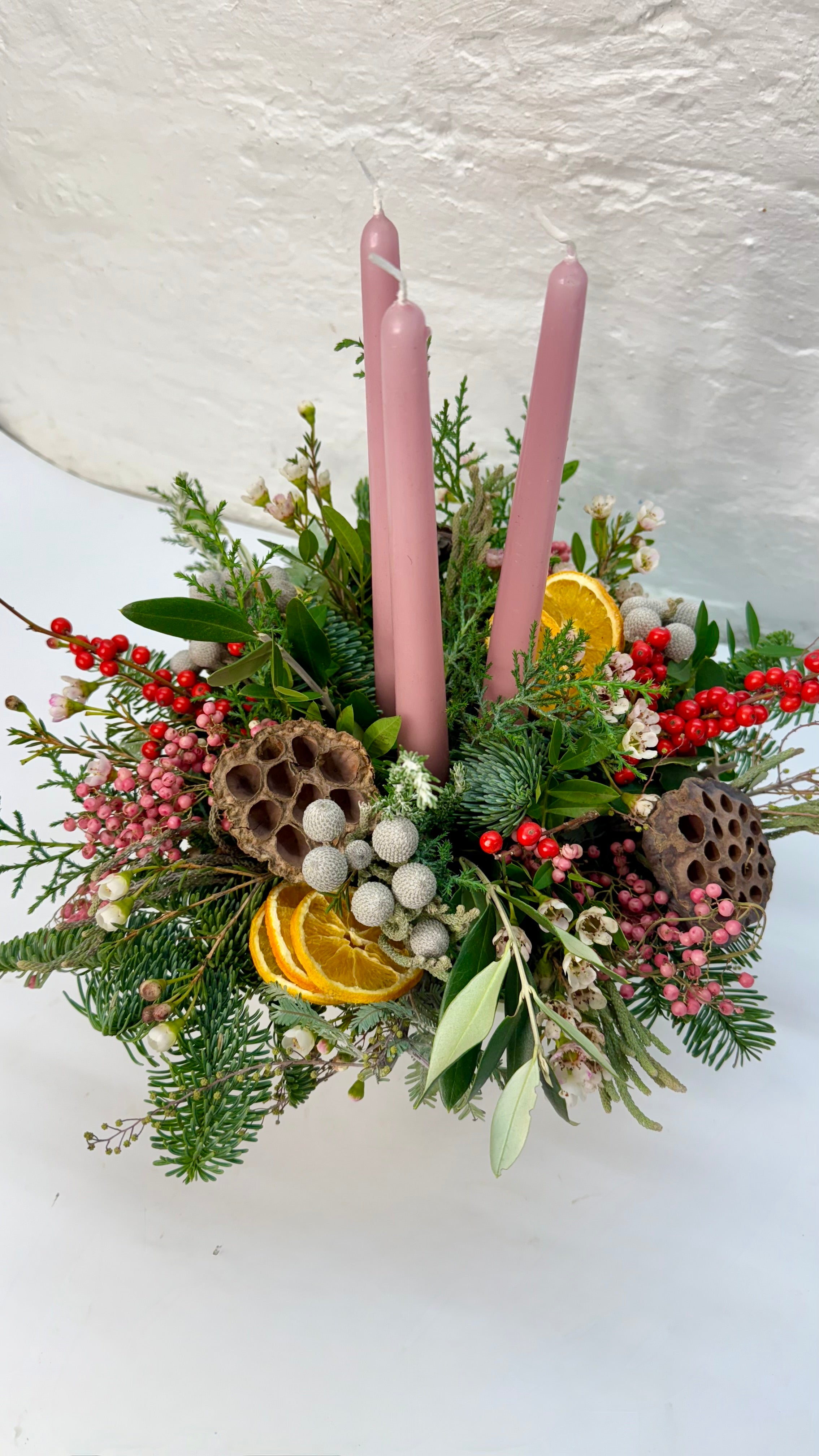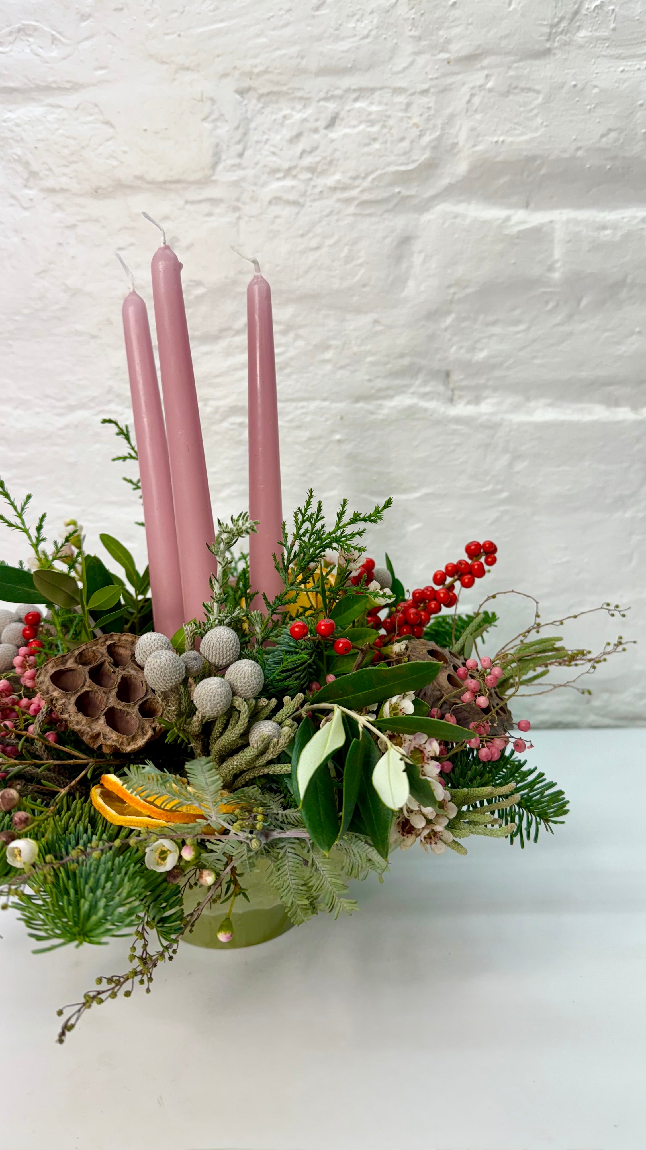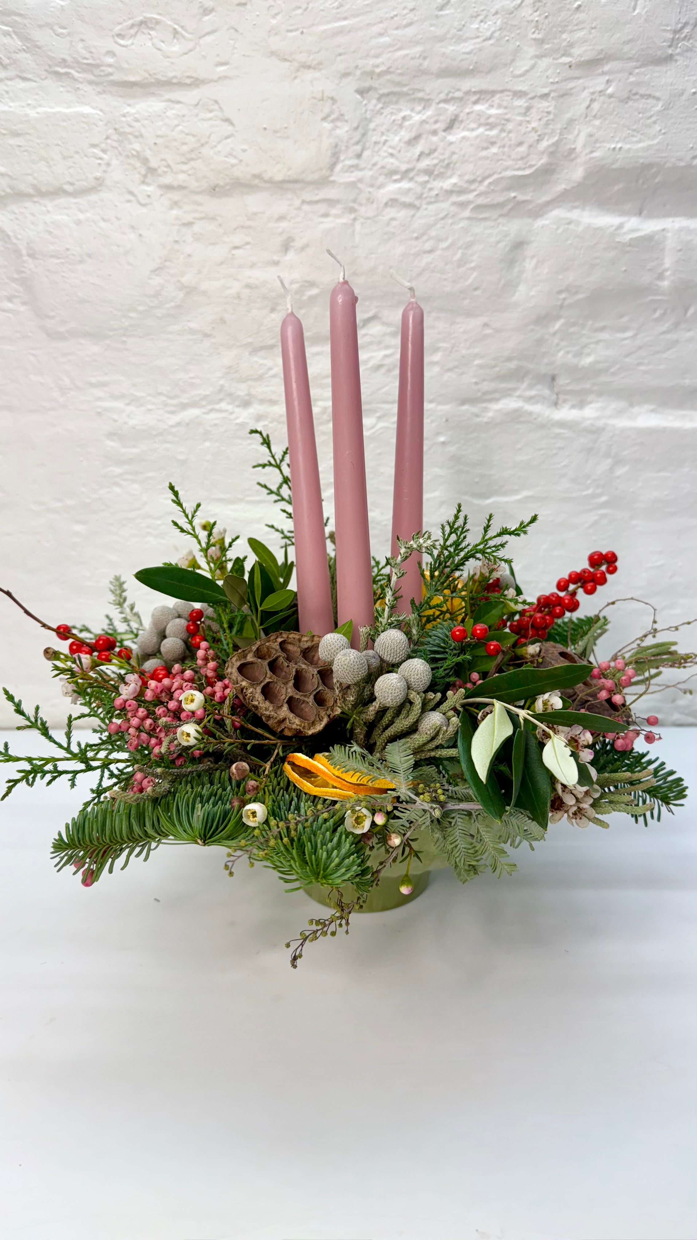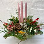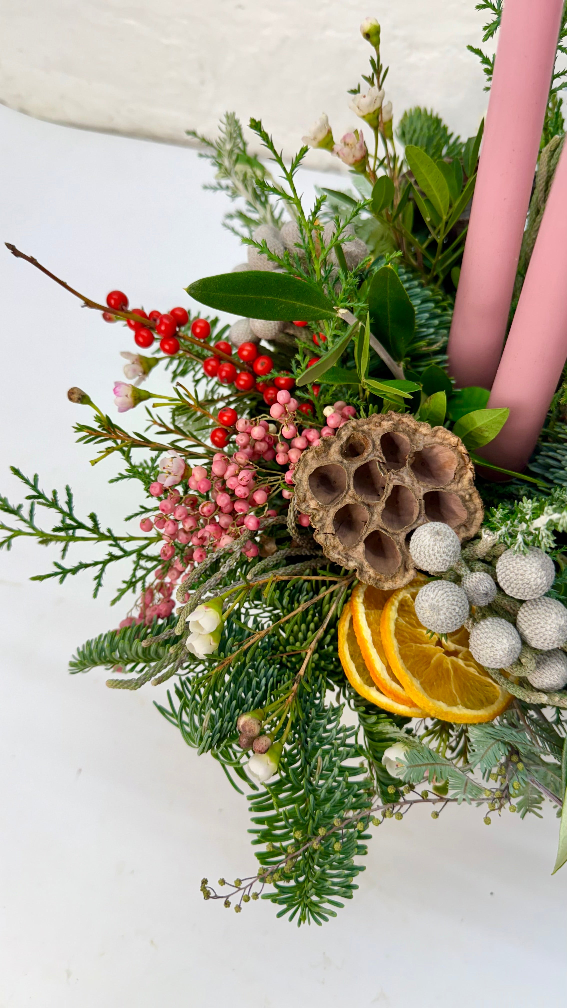 Elevate your festive décor with this elegant Christmas table arrangement, featuring a rich mix of seasonal foliage highlighted with ilex berries. Thoughtfully designed to bring warmth and sophistication to your home, this arrangement combines natural winter textures with soft festive tones for a truly refined look.