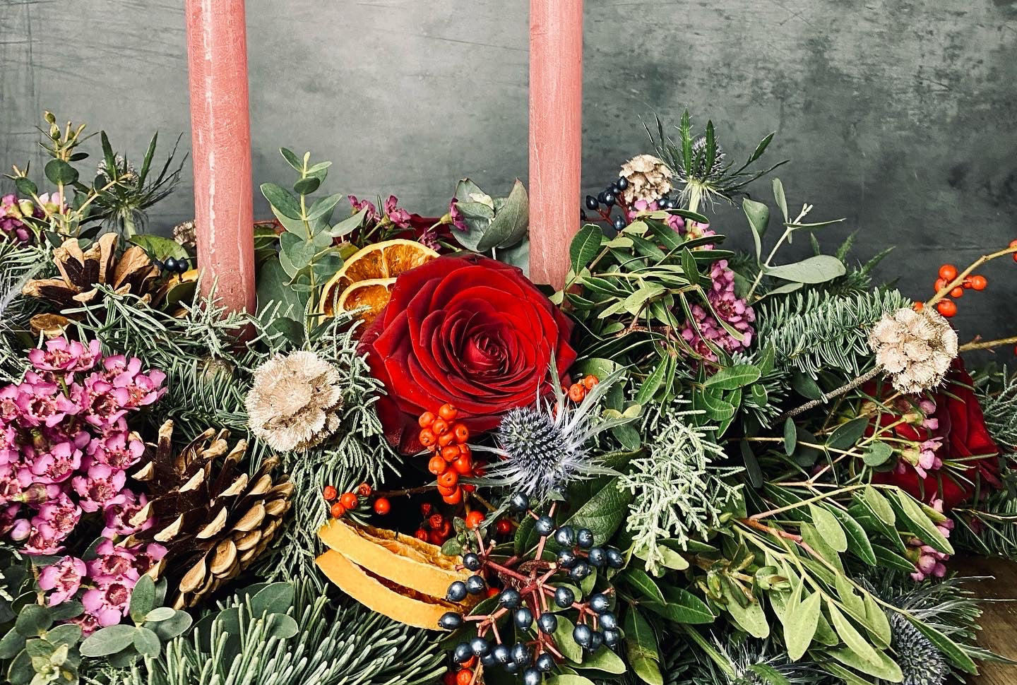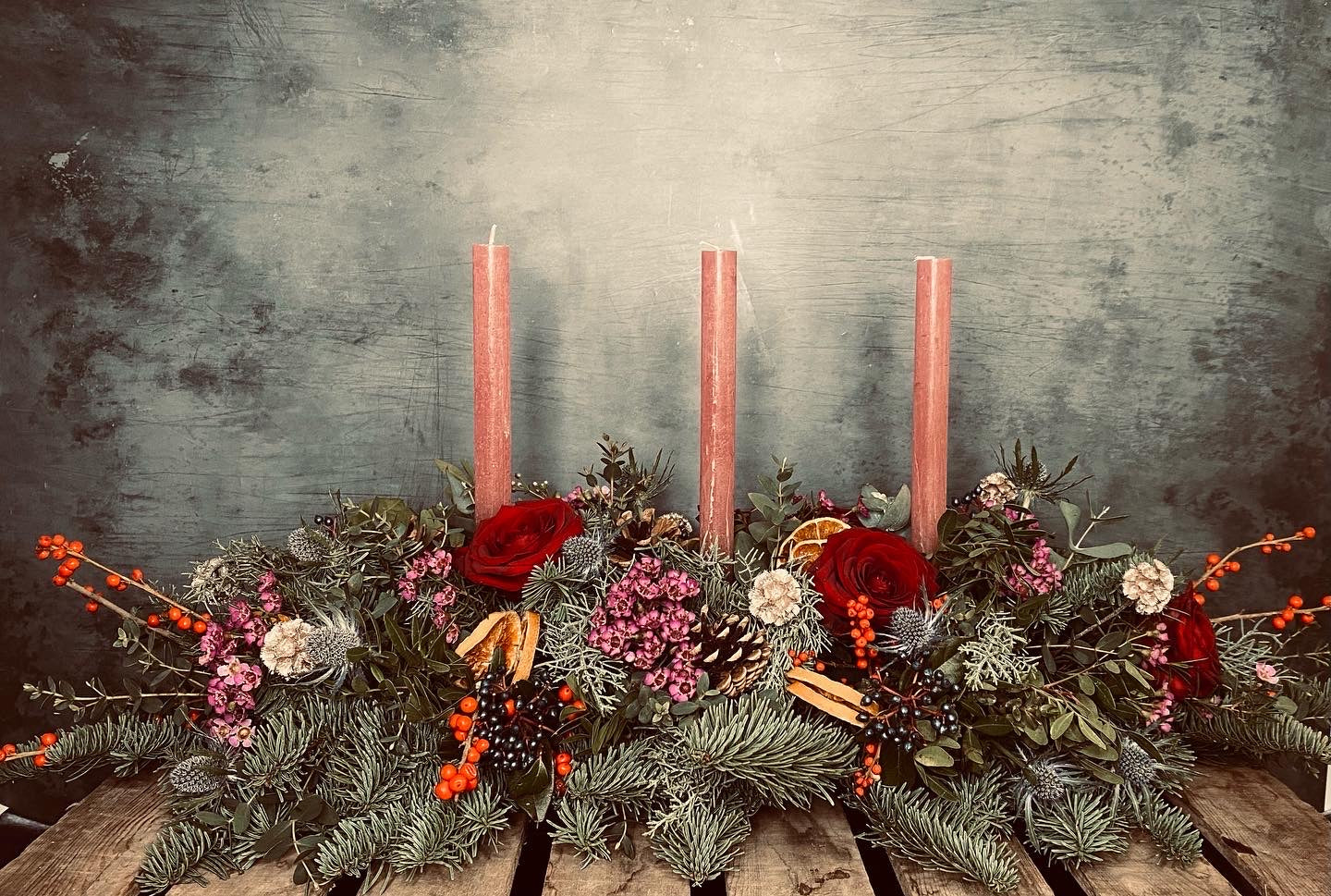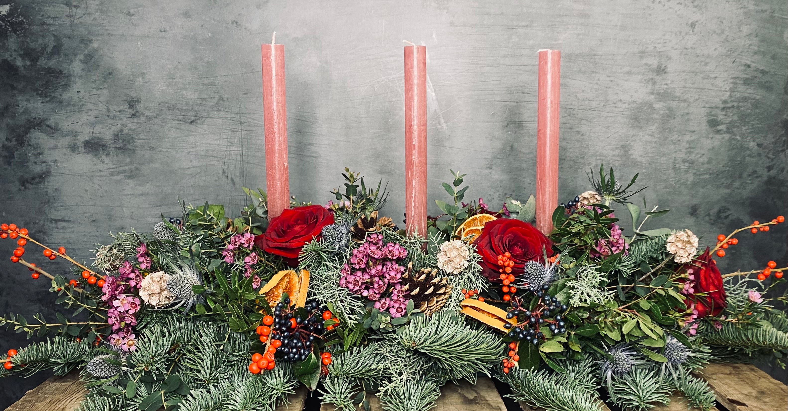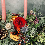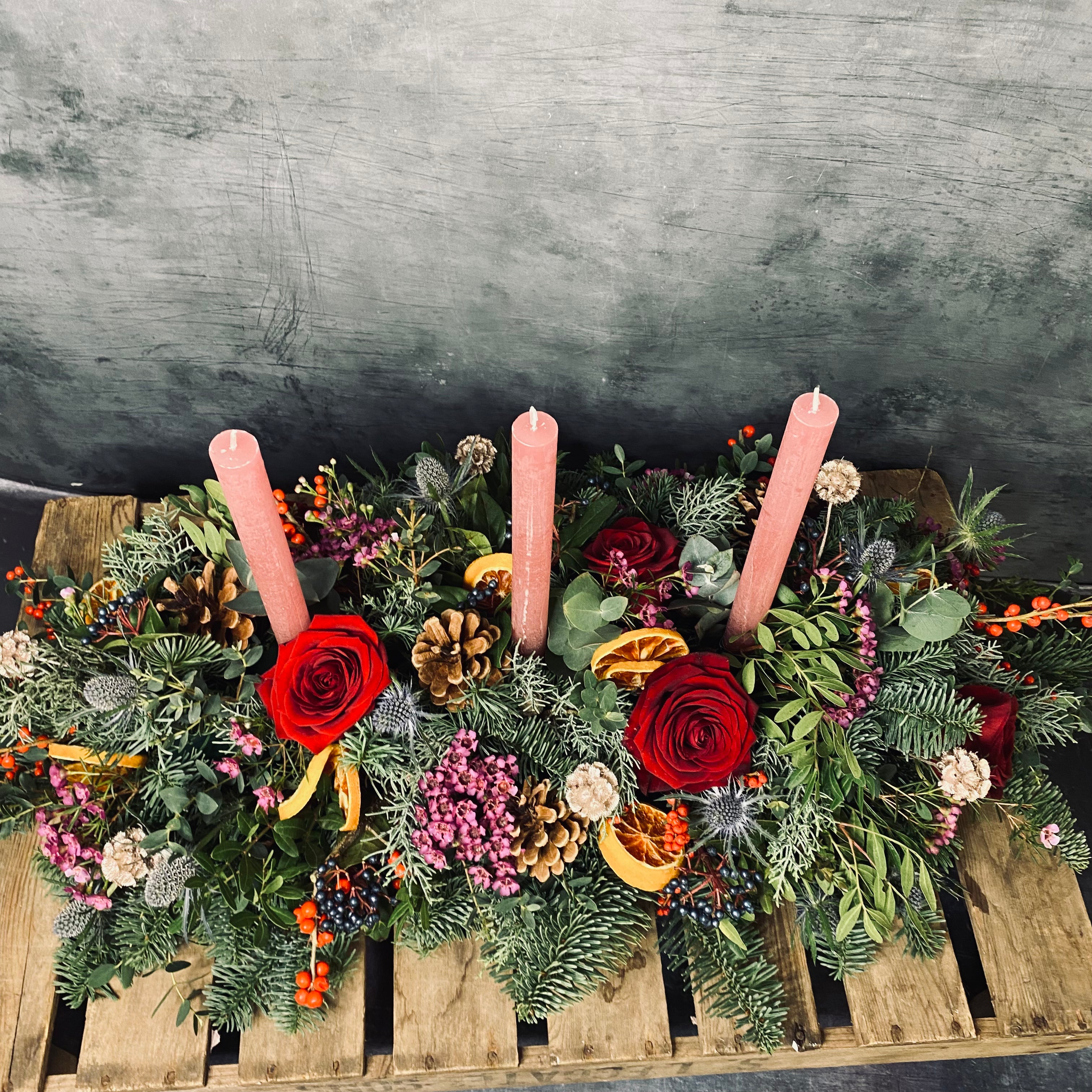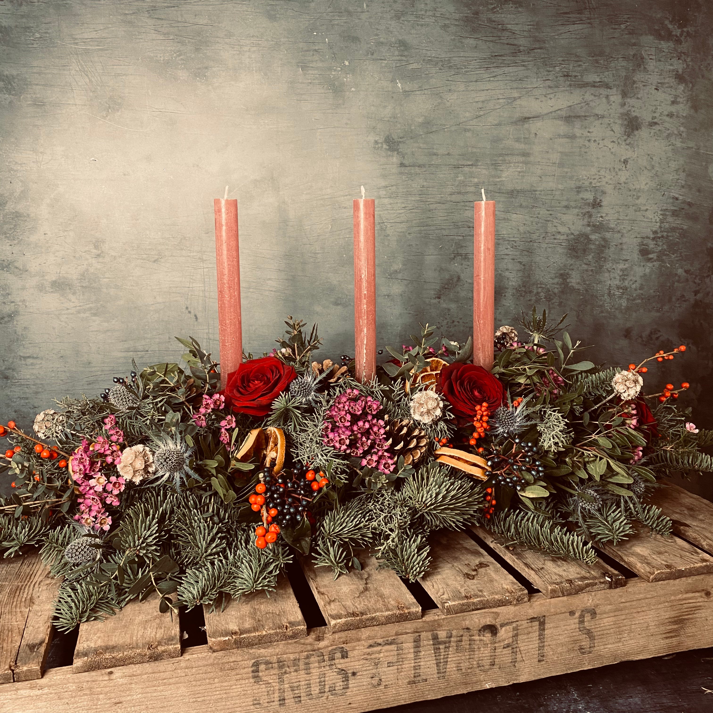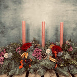 Featuring blue pine, thistle, wax flower, dried orange slices, eucalyptus, red roses includes three taper candles. This stunning table centrepiece is ideal for a rectangular dining table or coffee table. 2ft approx length.