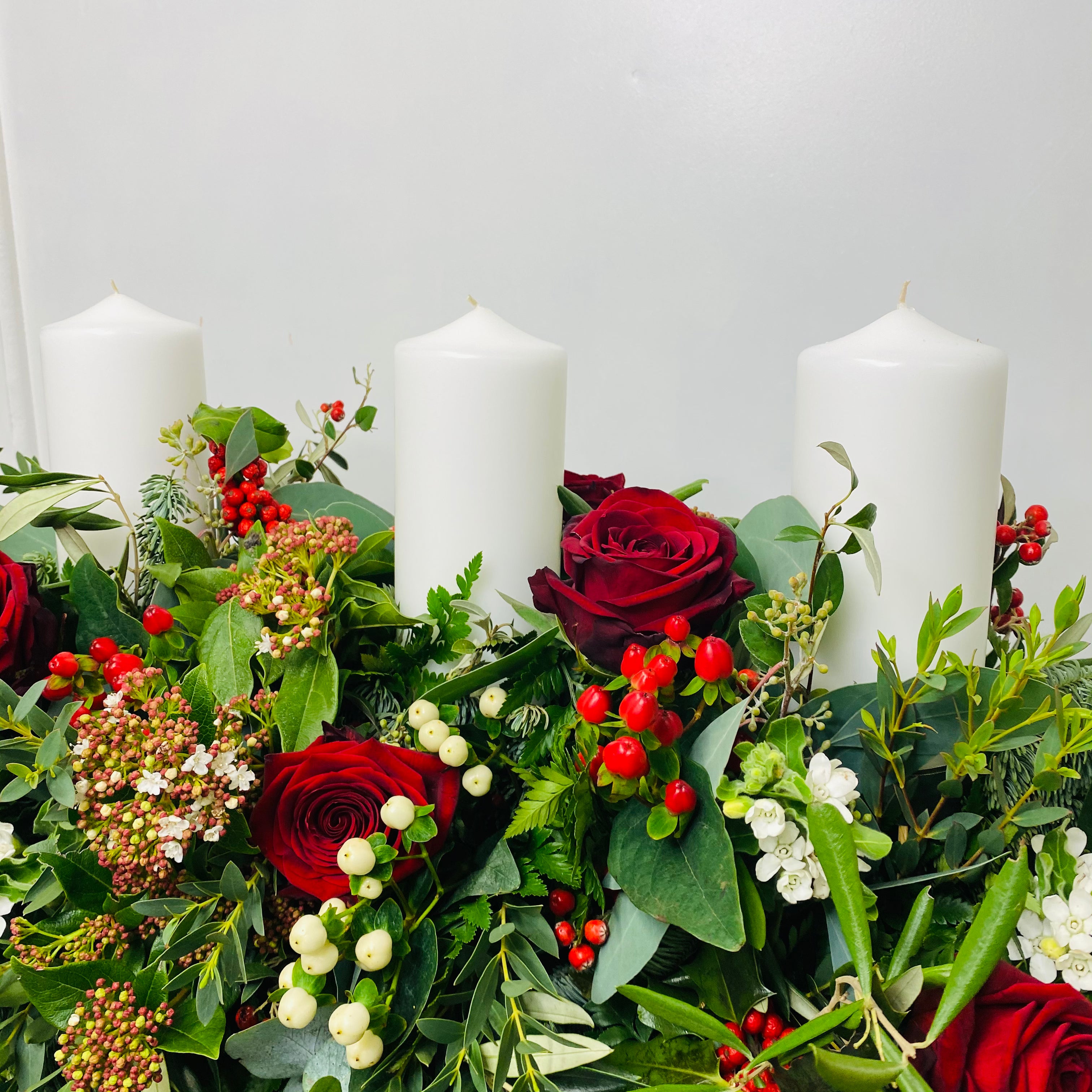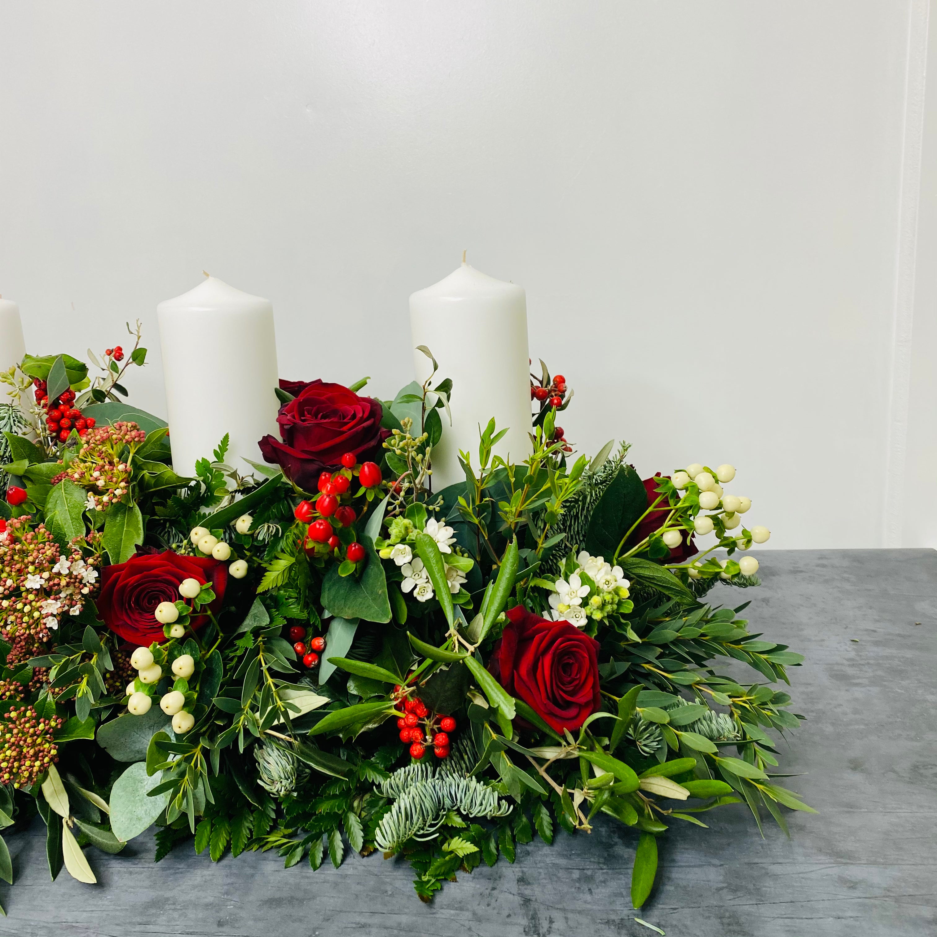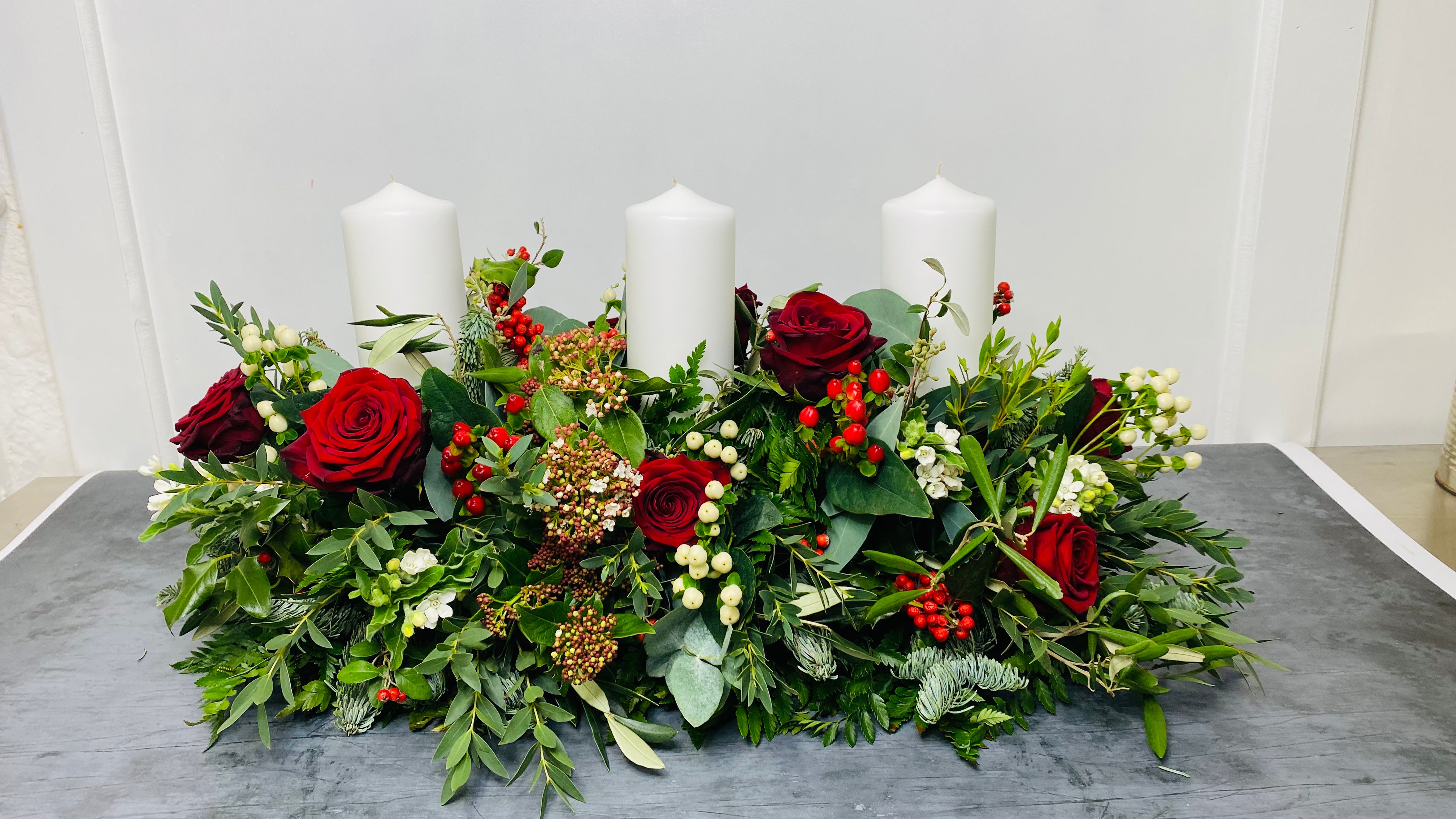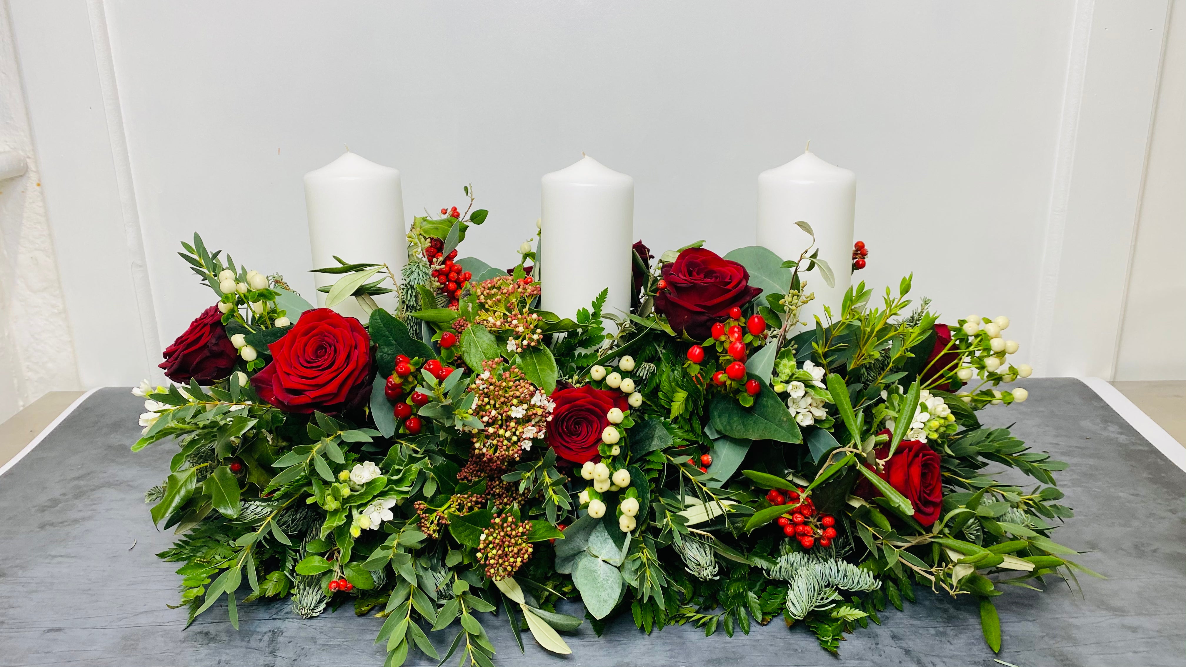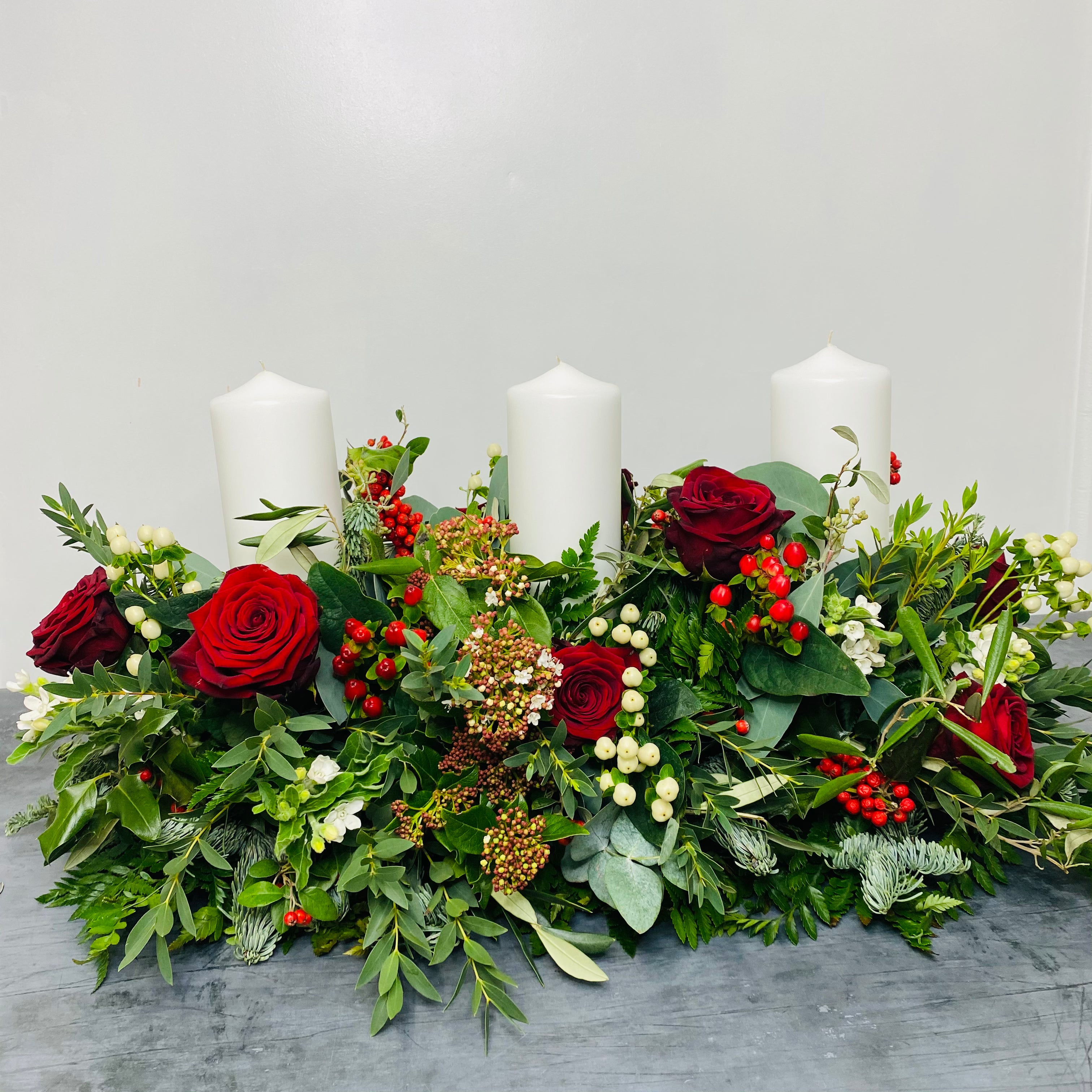 Let the centrepiece do the talking! Featuring blue pine, olive, eucalyptus and other seasonal foliage, festive berries and roses, and includes three church candles. This stunning table centrepiece is ideal for a rectangular dining table or side table. 80cm + approx. Please allow for next day delivery when ordering this arrangement. Thank you.