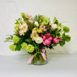 Primy Pastels Vase arrangement is arranged in a beautiful glass vase using a pastel colour palette keeping it light and bright, we use the freshest seasonal blooms and foliage on offer to us when making up your bouquet.