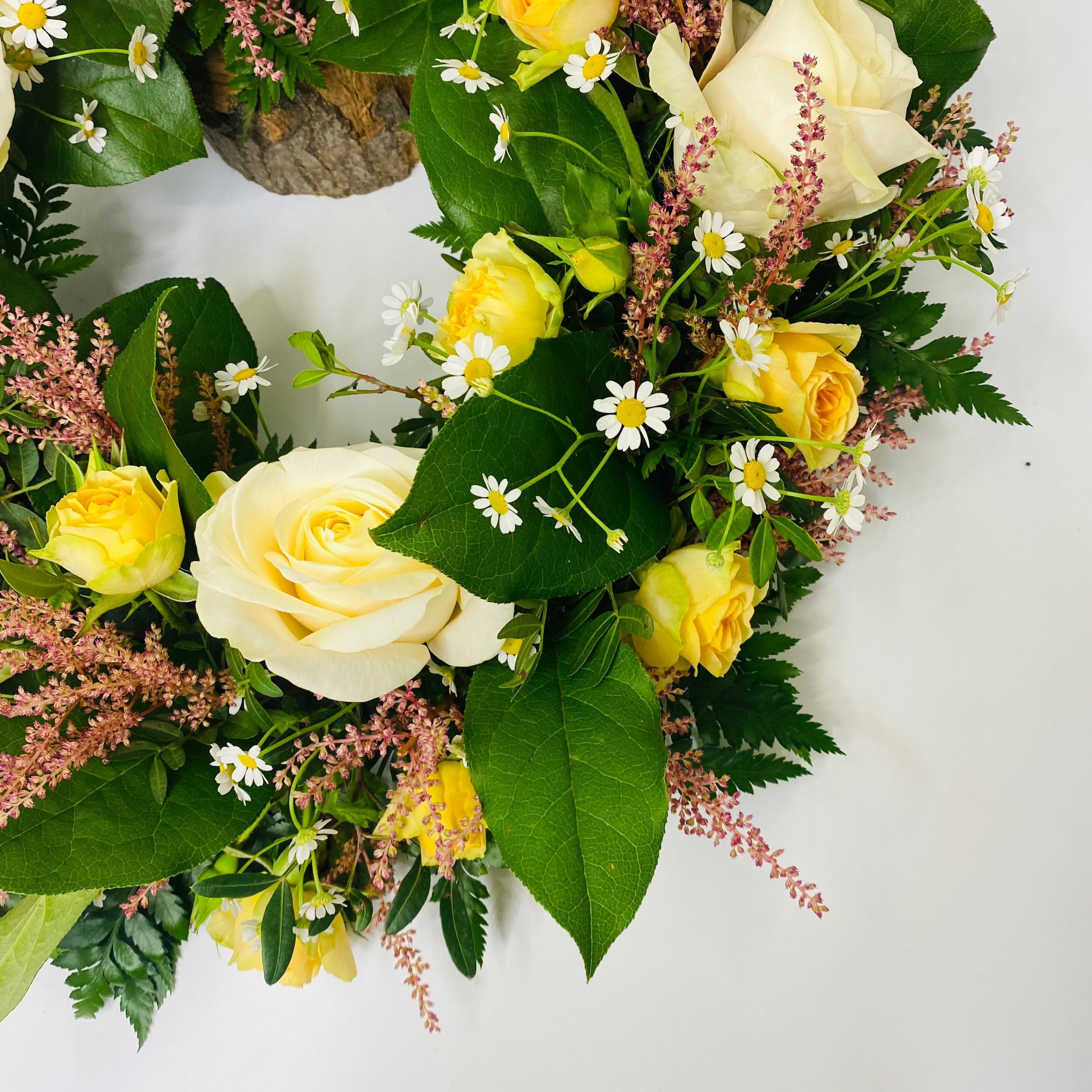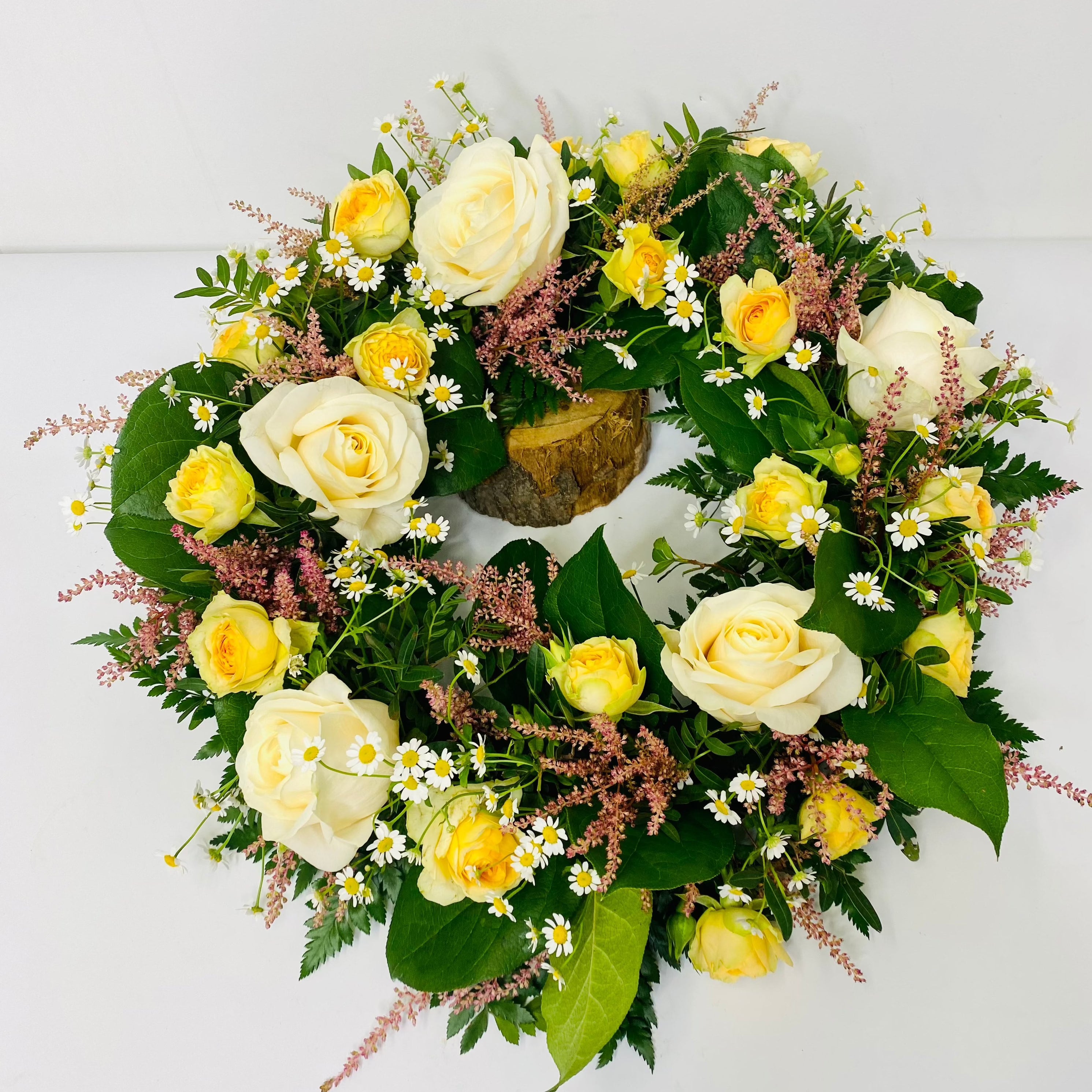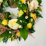 Yellow & Cream Rose Wreath is a floral foam wreath arranged with roses and other seasonal country garden flowers. If you would like a different colour palette please let us know in the notes section at the checkout, or give us a call to discuss your requirements.
