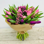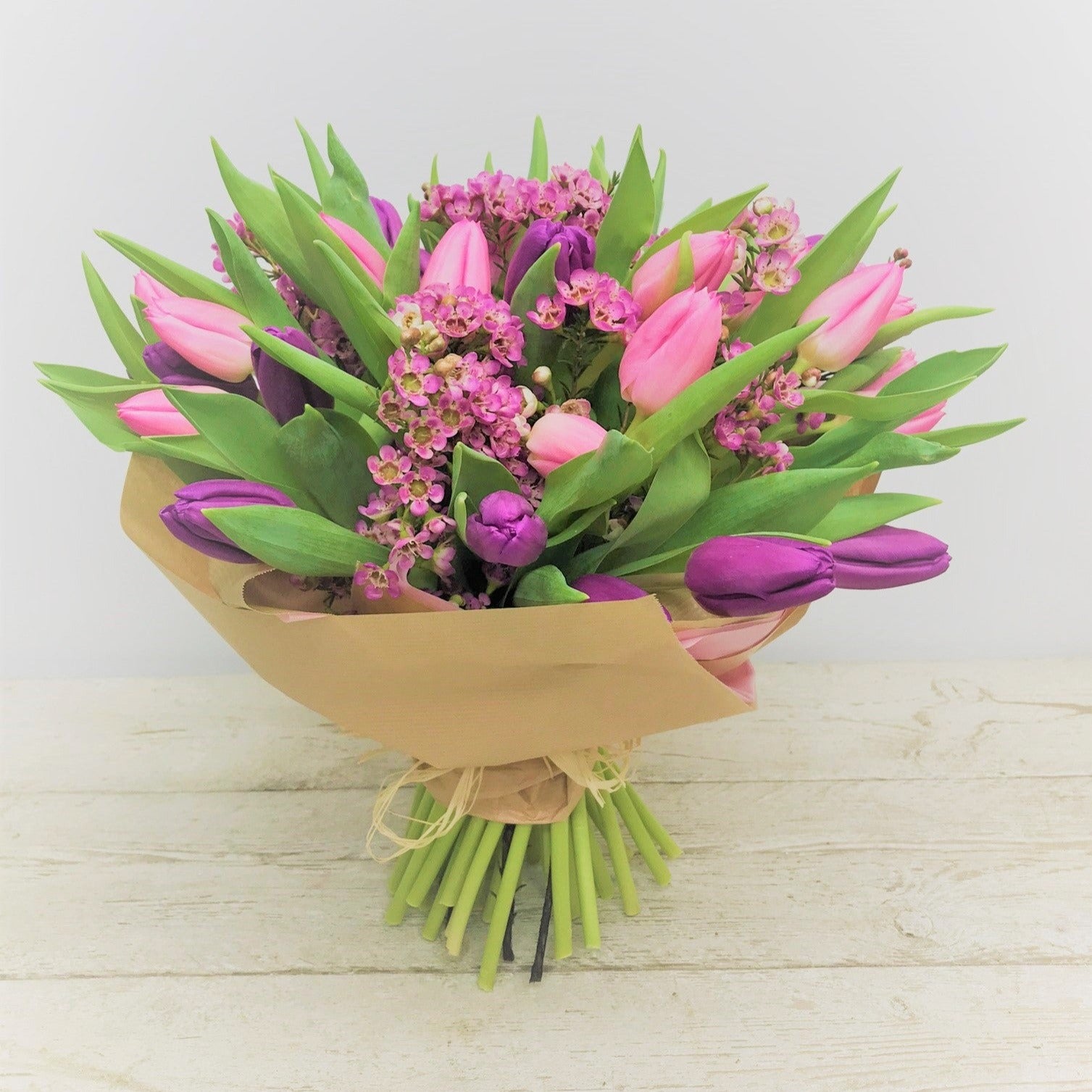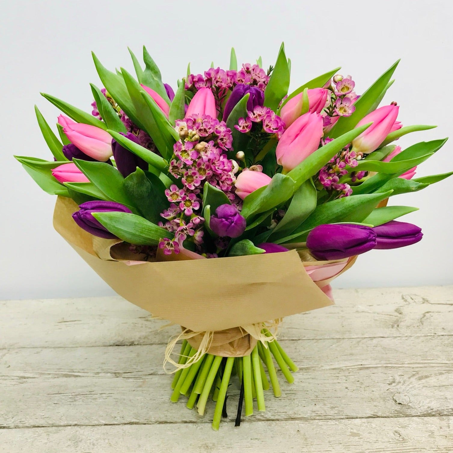 CORDELIA is a hand tied bouquet of spring flowers in a Pink Colour Palette including a selection of tulip varieties & wax flower.