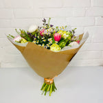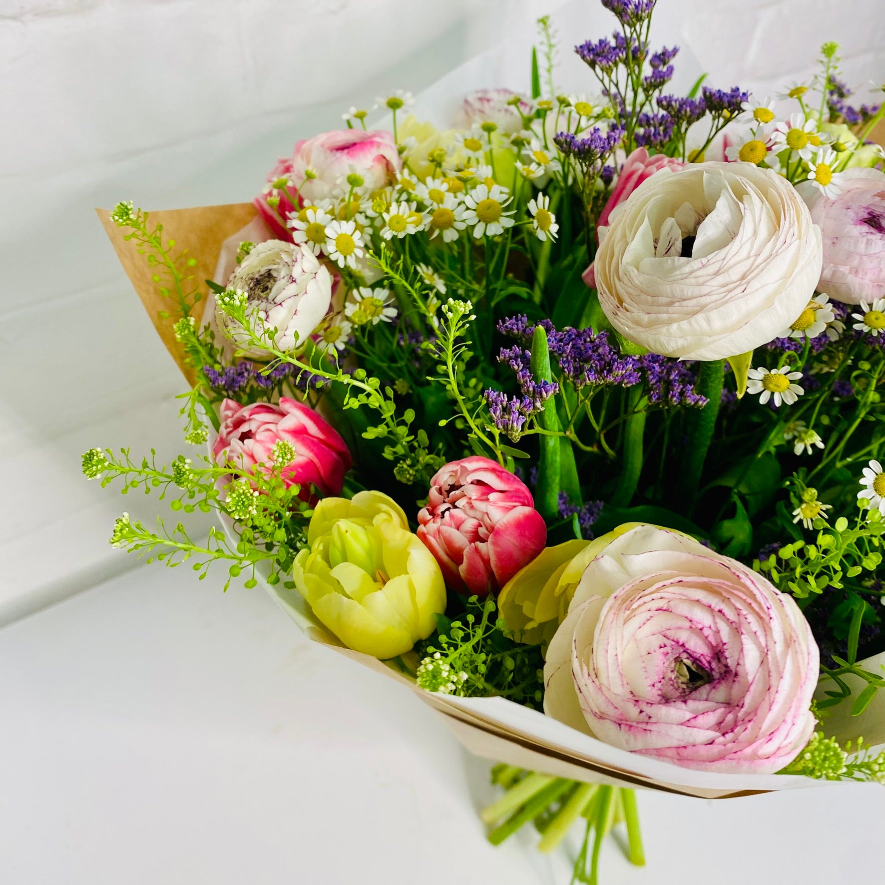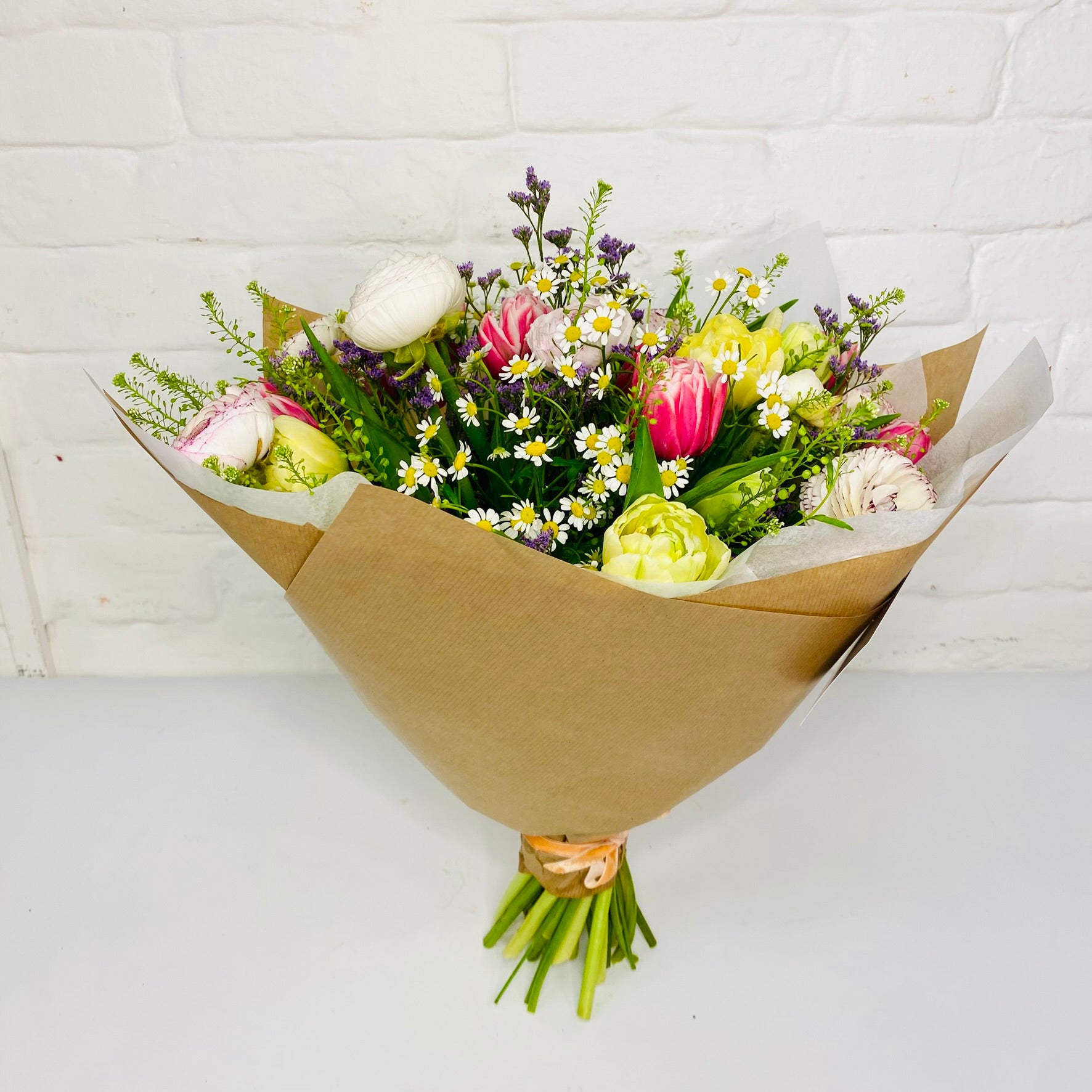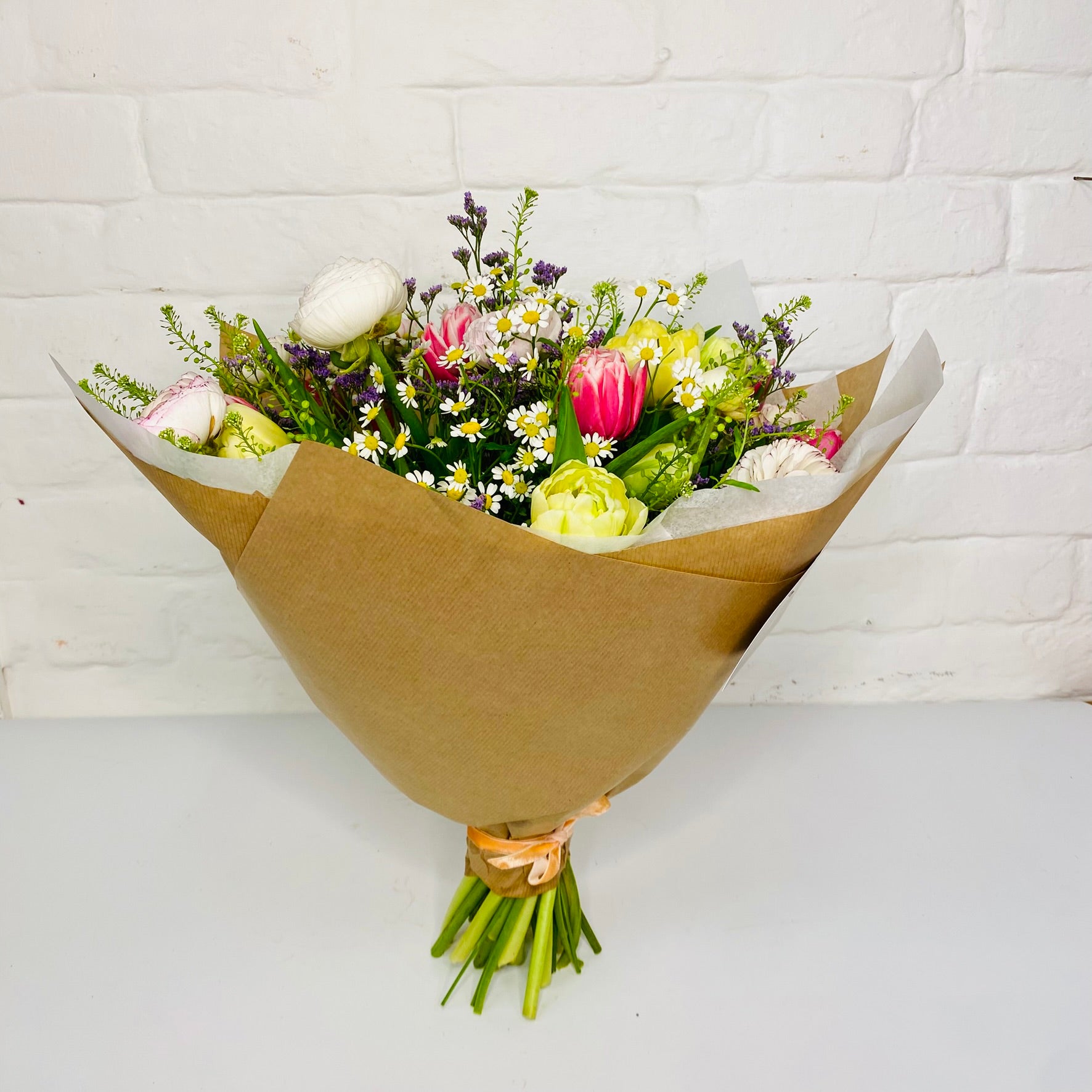 SPRING MORNING is a seasonal hand tied bouquet made up of the finest spring flowers, selected for there quality & definition. The selection may include tulips, ranunculus, ginesta, limonium & seasonal foliage.