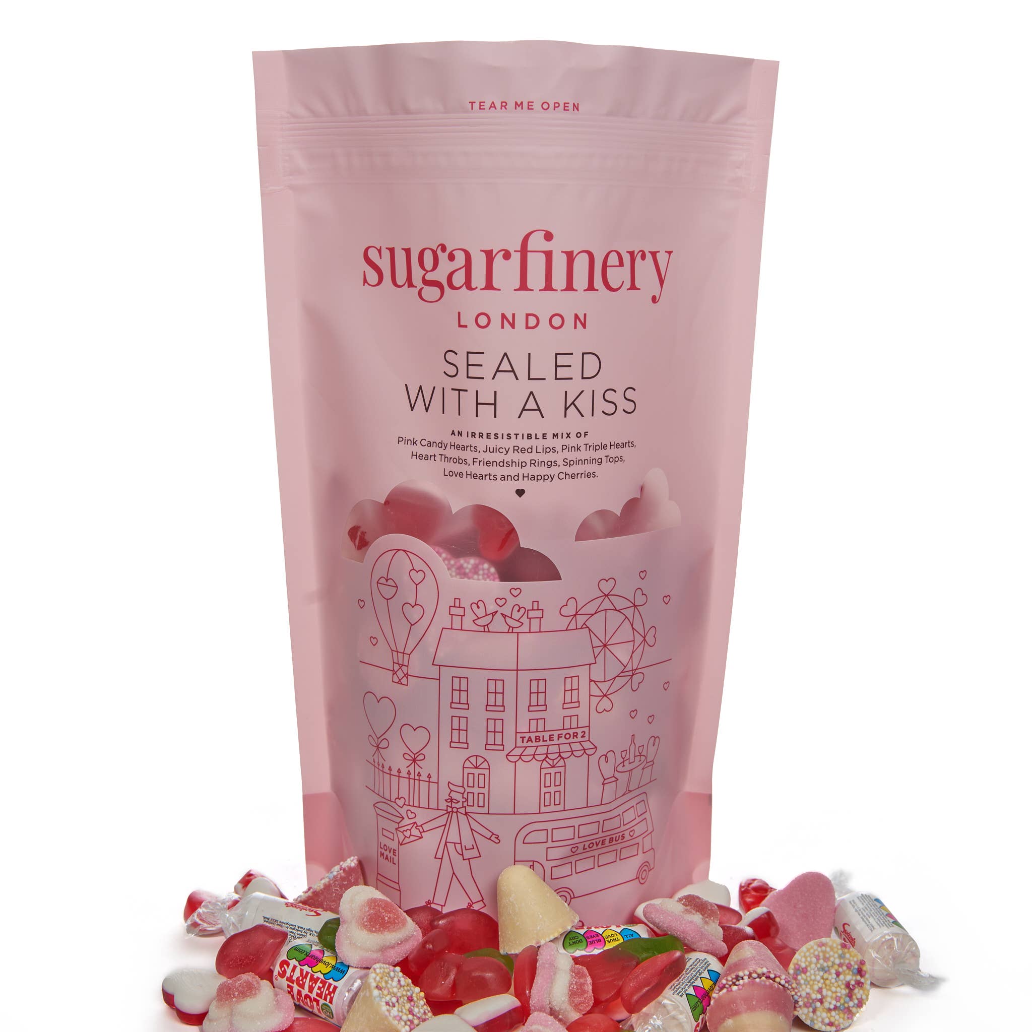 Sealed With A Kiss An Irresistible Mix of Sweets: Pink Candy Hearts, Juicy Red Lips, Pink Triple Hearts, Heart Throbs, Friendship Rings, Spinning Tops, Love Hearts and Happy Cherries A wonderful gift for anyone at anytime of year.