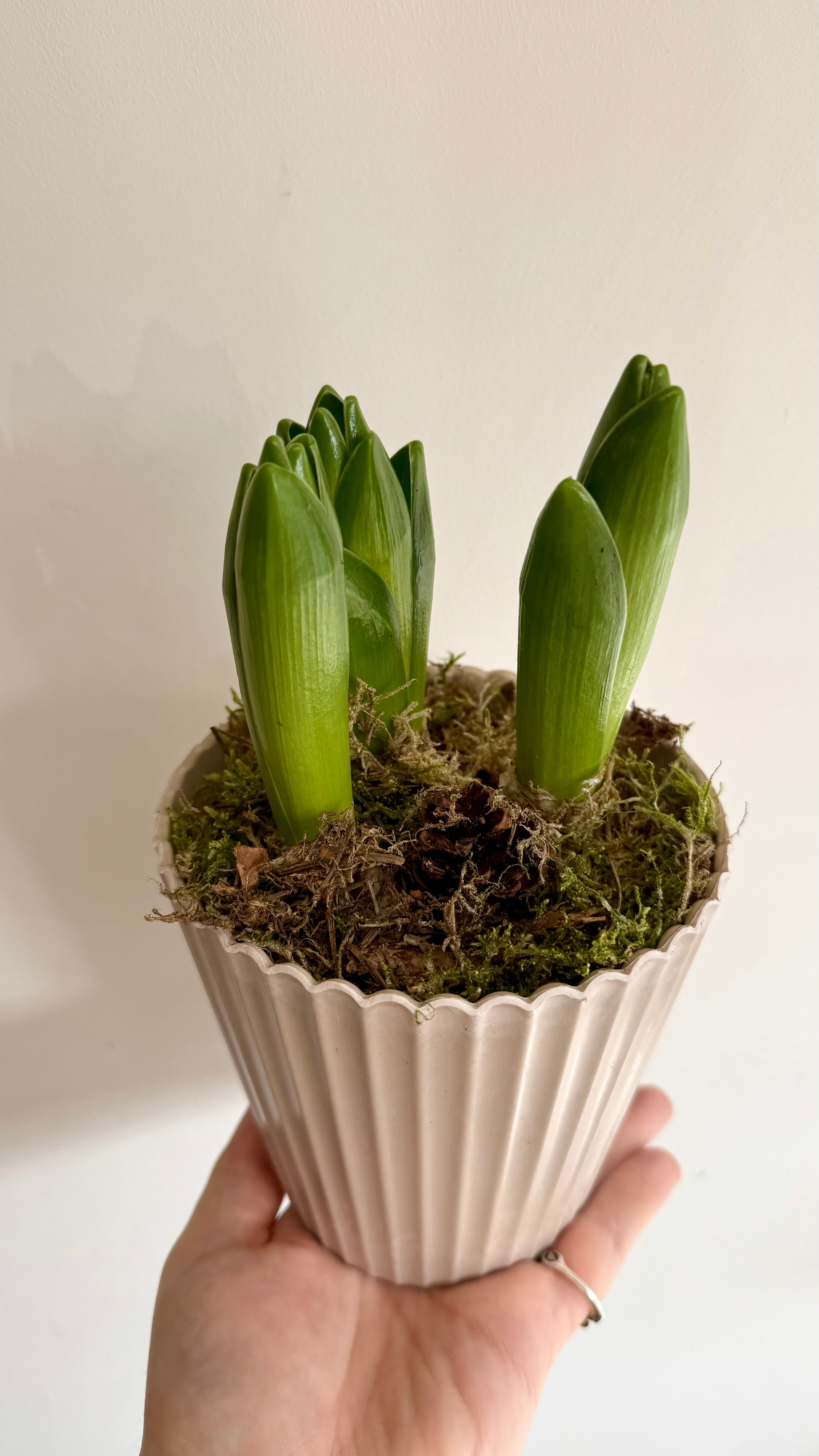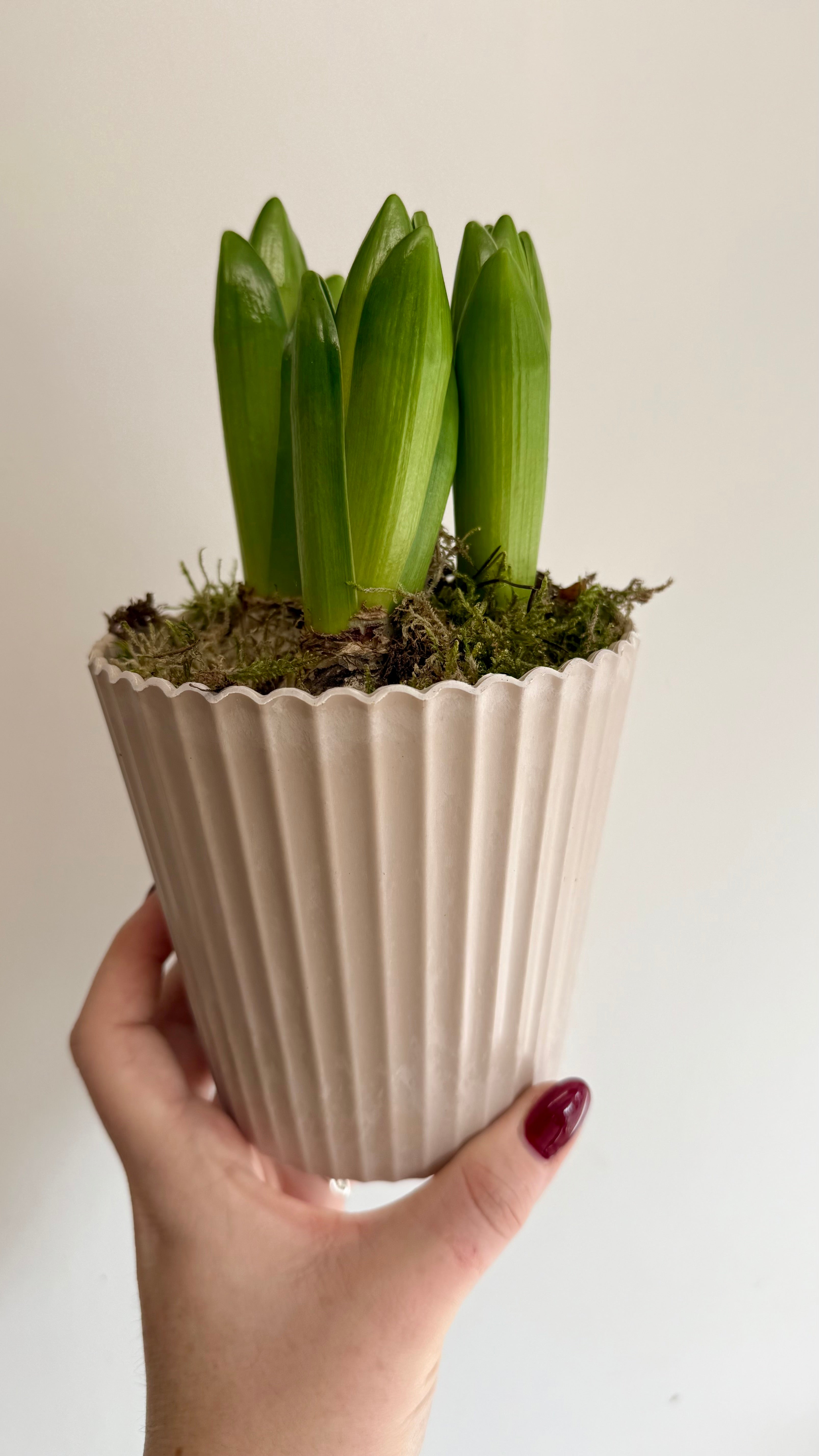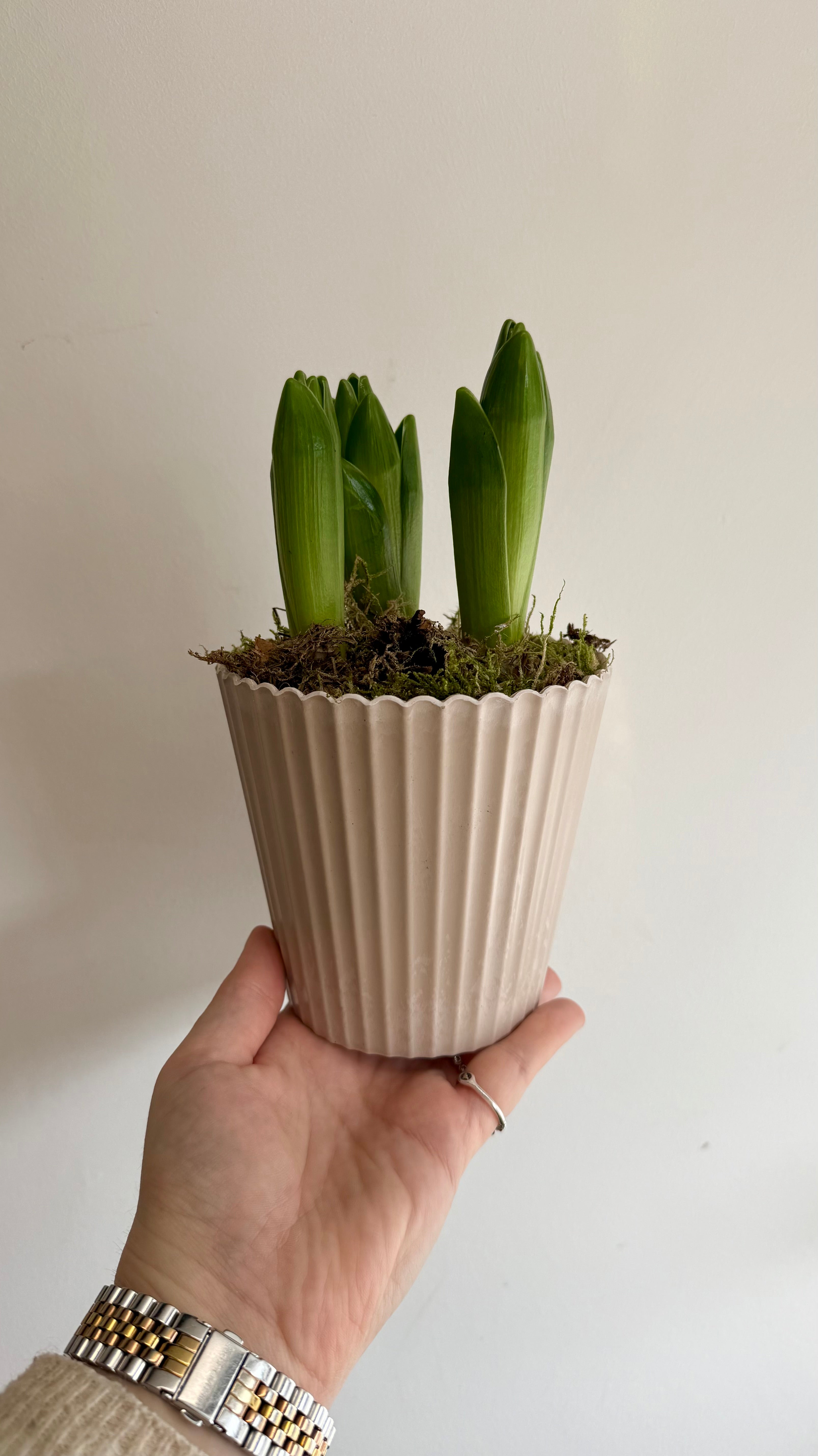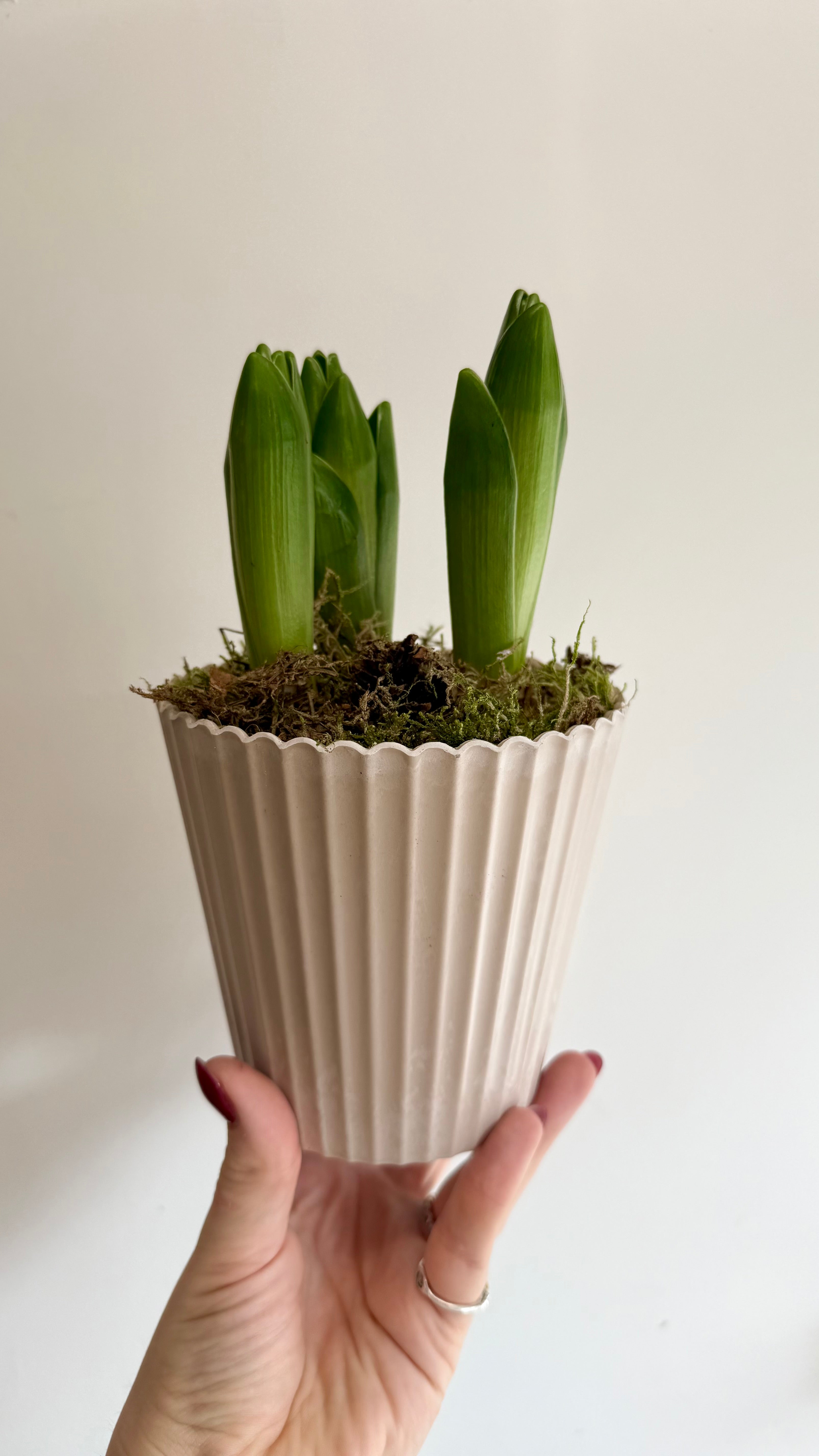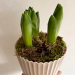 Transform your living space with these White Hyacinth Bulbs, planted in a stone-look melamine pot and covered with lush moss. Enjoy the fragrance and elegance of these blooms, adding a touch of nature and charm to any room. (You don't have to be a green thumb to appreciate these beauties!)