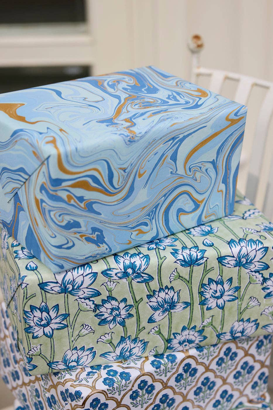 Our beautiful range of premium gift wrap is hand block printed on ivory cotton paper using 2 or more colours. A separate wooden block is used for each colour application. Symmetry forms the core of the design and pattern repeats must be perfectly balanced. The colours are stamped one at a time and a high level of skill and precision is required to produce every sheet. The result is a truly stunning sheet of paper which is guaranteed to 'wow'!