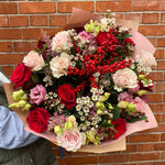 A bouquet of assorted flowers including red and white roses, greenery, and other seasonal flowers, wrapped in brown paper with a card.