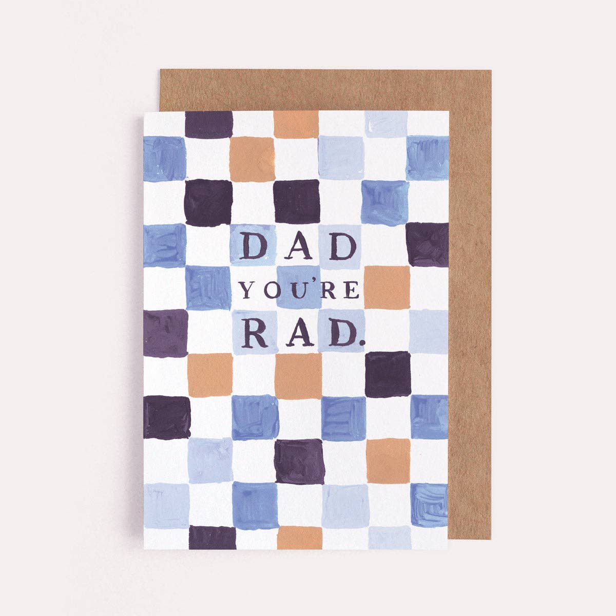 Let your dad know just how rad he is with this Father's Day card or Dad Birthday card, featuring a hand-lettered "Dad you're rad' caption on a blue, white and orange checkerboard background.