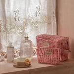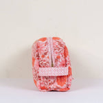 Vintage Pink Floribunda Large Toiletry bag is a hand block-printed cotton quilted cosmetic bag with a waterproof lining, 3 interior pockets, a convenient carry handle, and a metal zip featuring a handcrafted cotton pull. It's the perfect travel case for holidays and everyday essentials. Available in a range of colours and sizes; mix and match for beautiful spring visual merchandising displays. Our popular washbags are perfect for updating your bathroom décor this spring and summer. Combining vintage charm with practical use, they make unique birthdays, Valentine's Day, or Mother's Day gifts. We partner with a small, family-run business in Jaipur dedicated to a zero-waste policy. Their expertise in 16th-century block printing, coupled with a strong commitment to sustainability, ensures our products are meticulously crafted. Ethically Handmade in India Cotton Block Print | Waterproof Lining Cool Handwash 3 Interior Pockets Size | W25cm x H17cm x D10cm