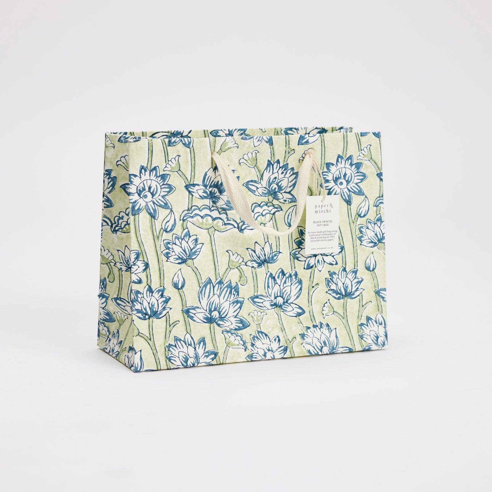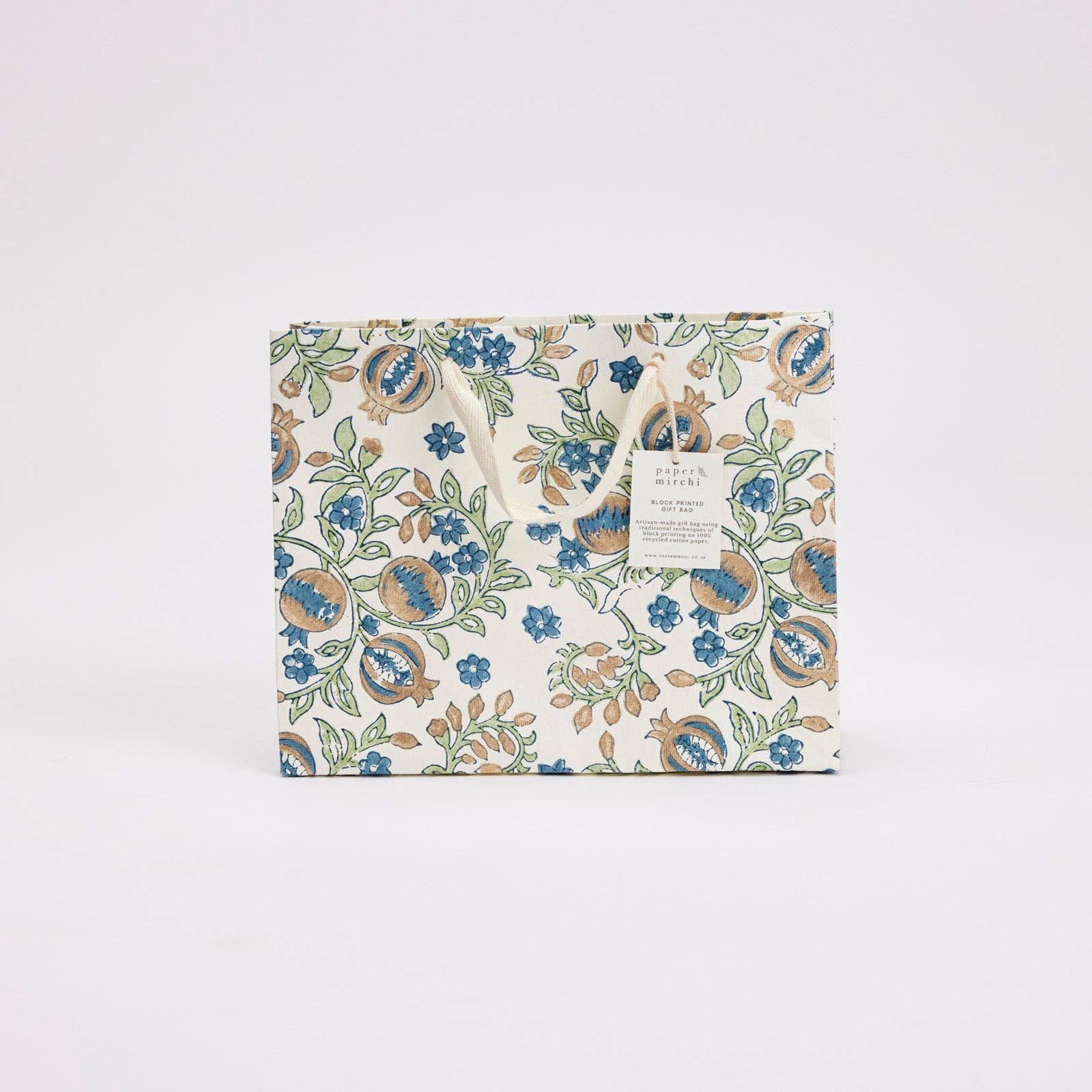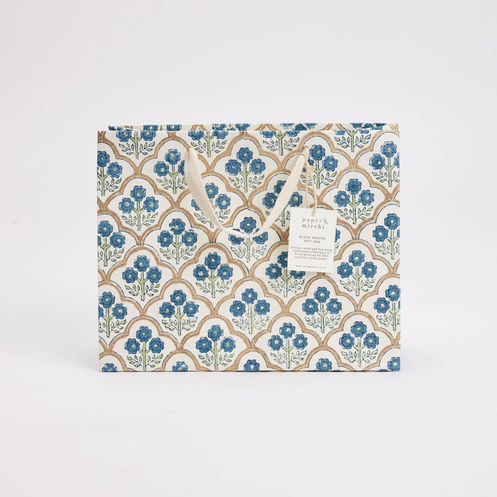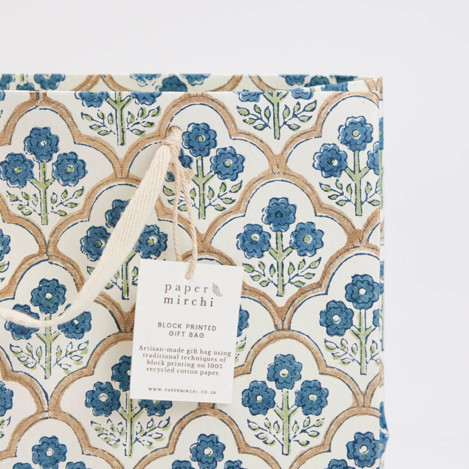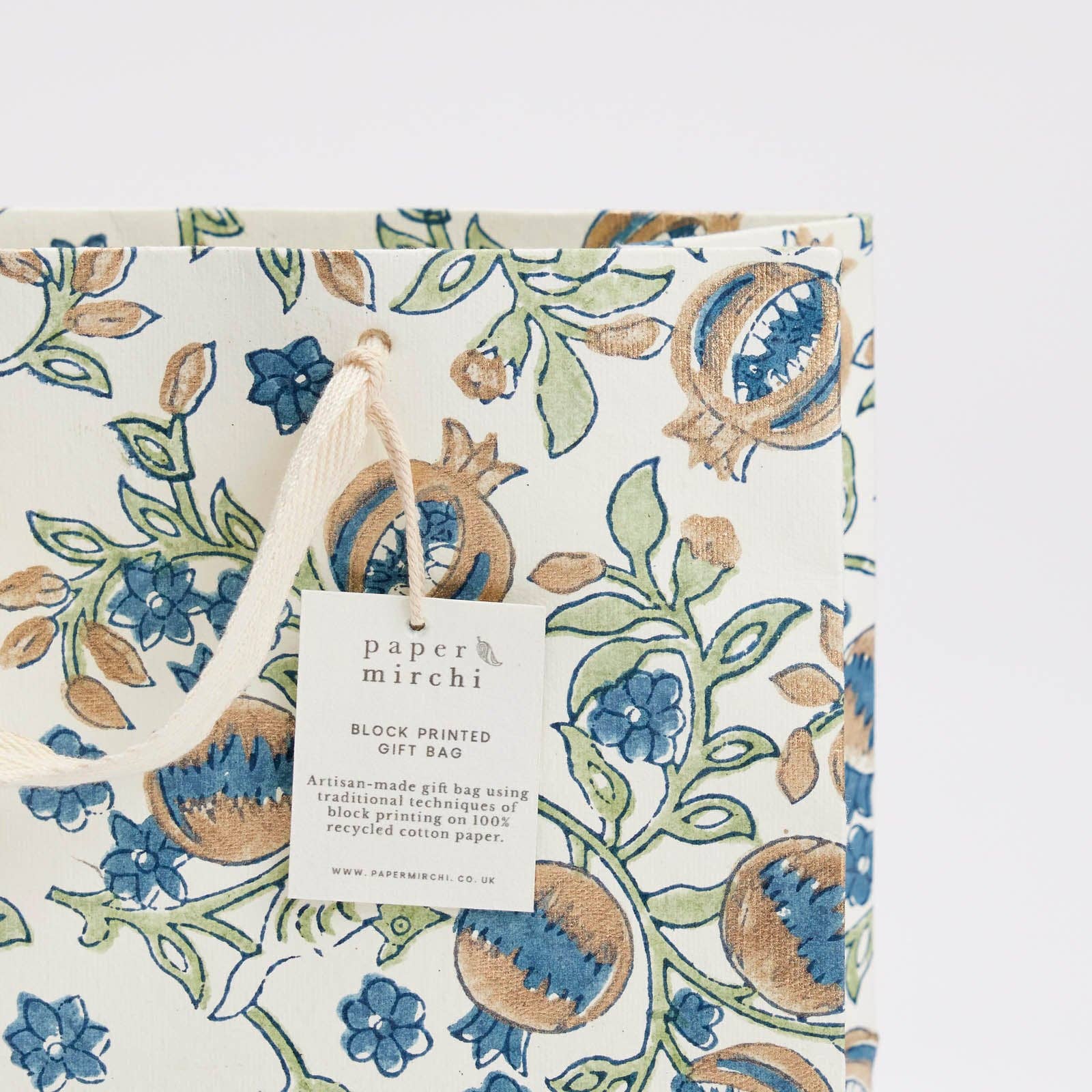 Our hand block printed gift bags are made from a strong 250gsm recycled cotton card paper in colours and designs complementing the gift wrap range.