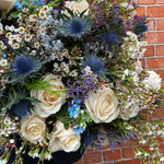 HIGHLAND BOUQUET is a seasonal hand tied bouquet cream roses, blue thistle, white waxflower, purple limonium and seasonal foliage.