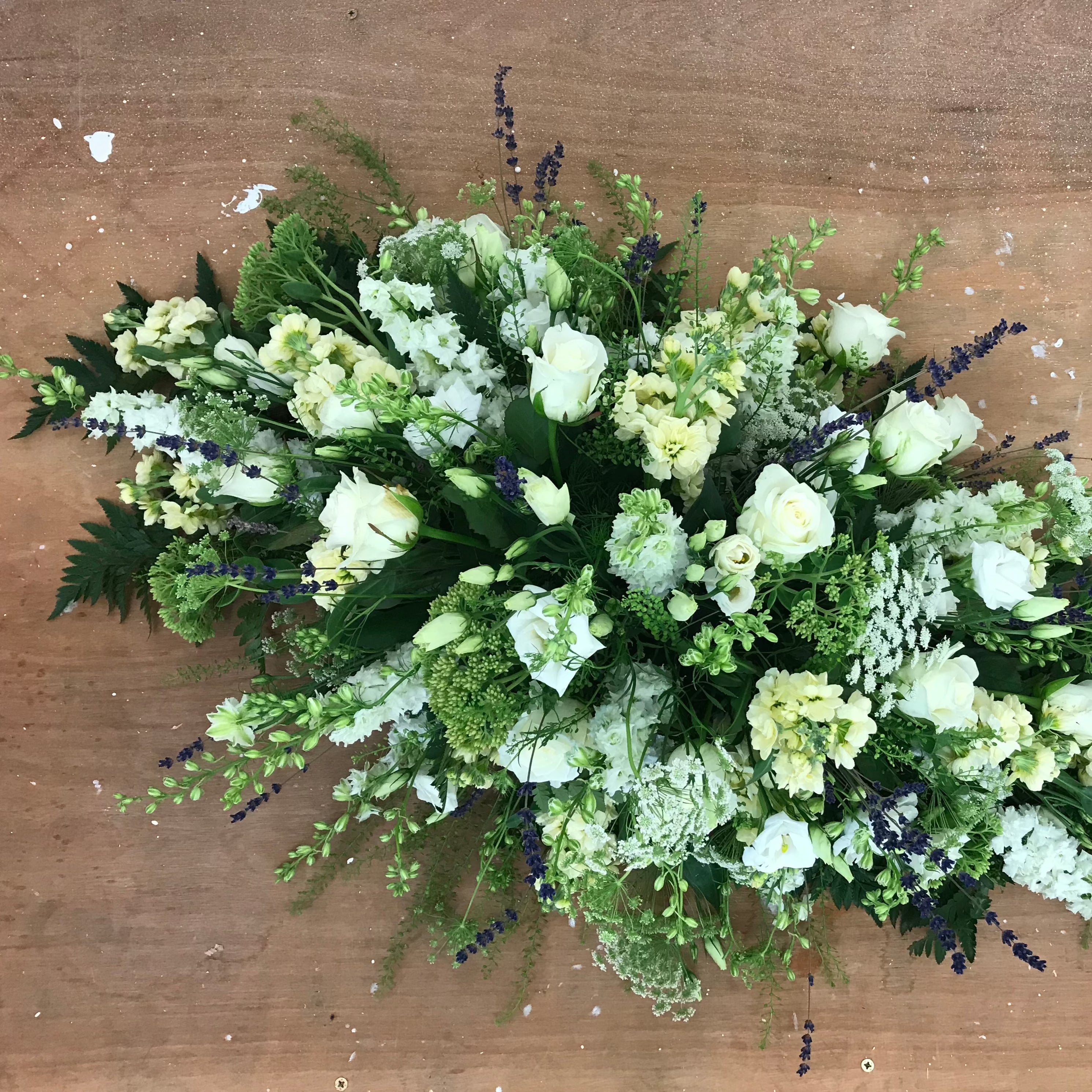 Lavender Country Garden is a floral foam coffin spray arranged with dried or fresh lavender, roses, stocks, lisianthus & other seasonal flowers to create a meadow of lavender, whites & creams. Please note as standard this will be made in white, cream & lavender if you would like another colour please let us know in the notes section at the checkout or give us a call to discuss your requirements.