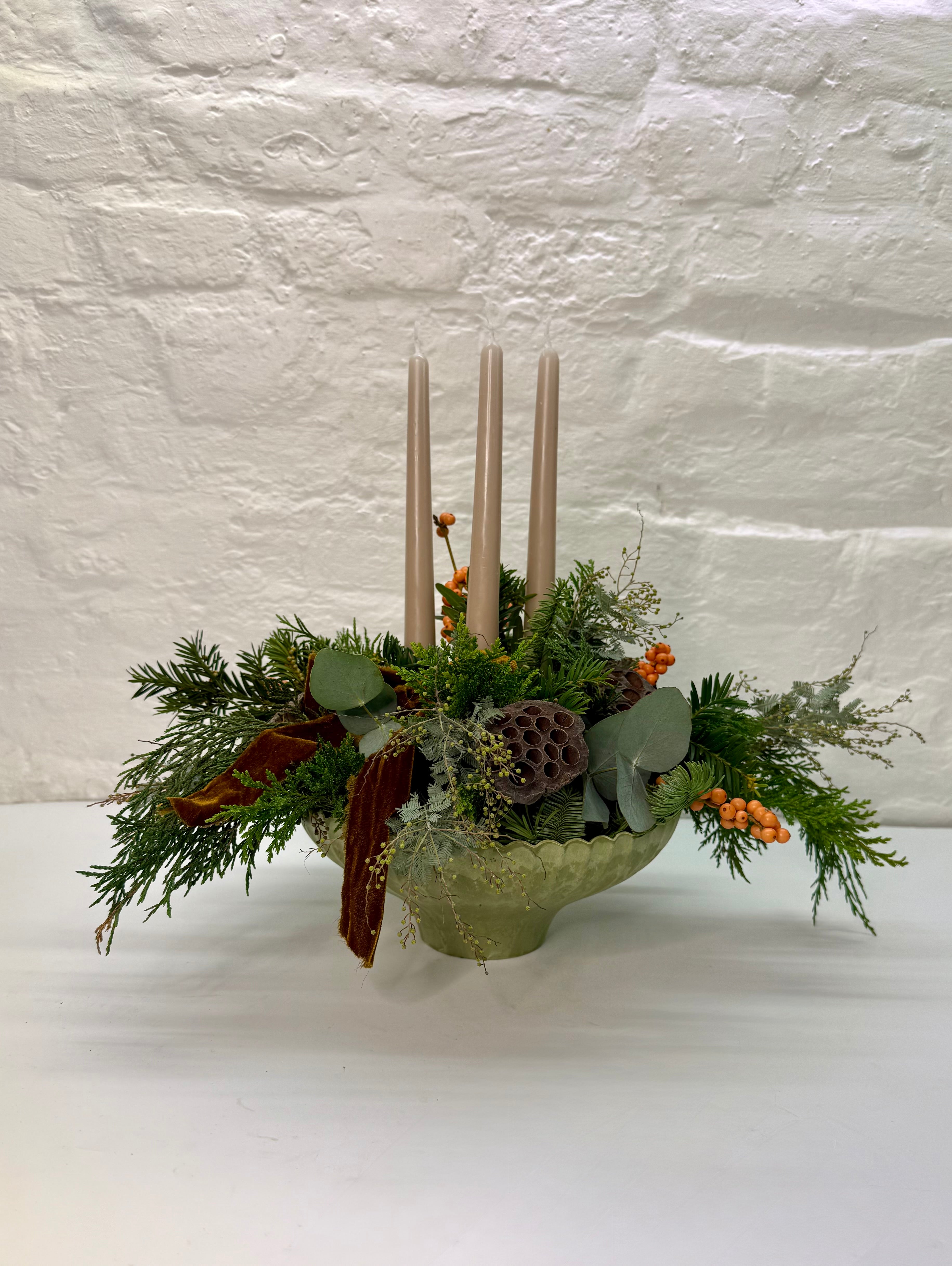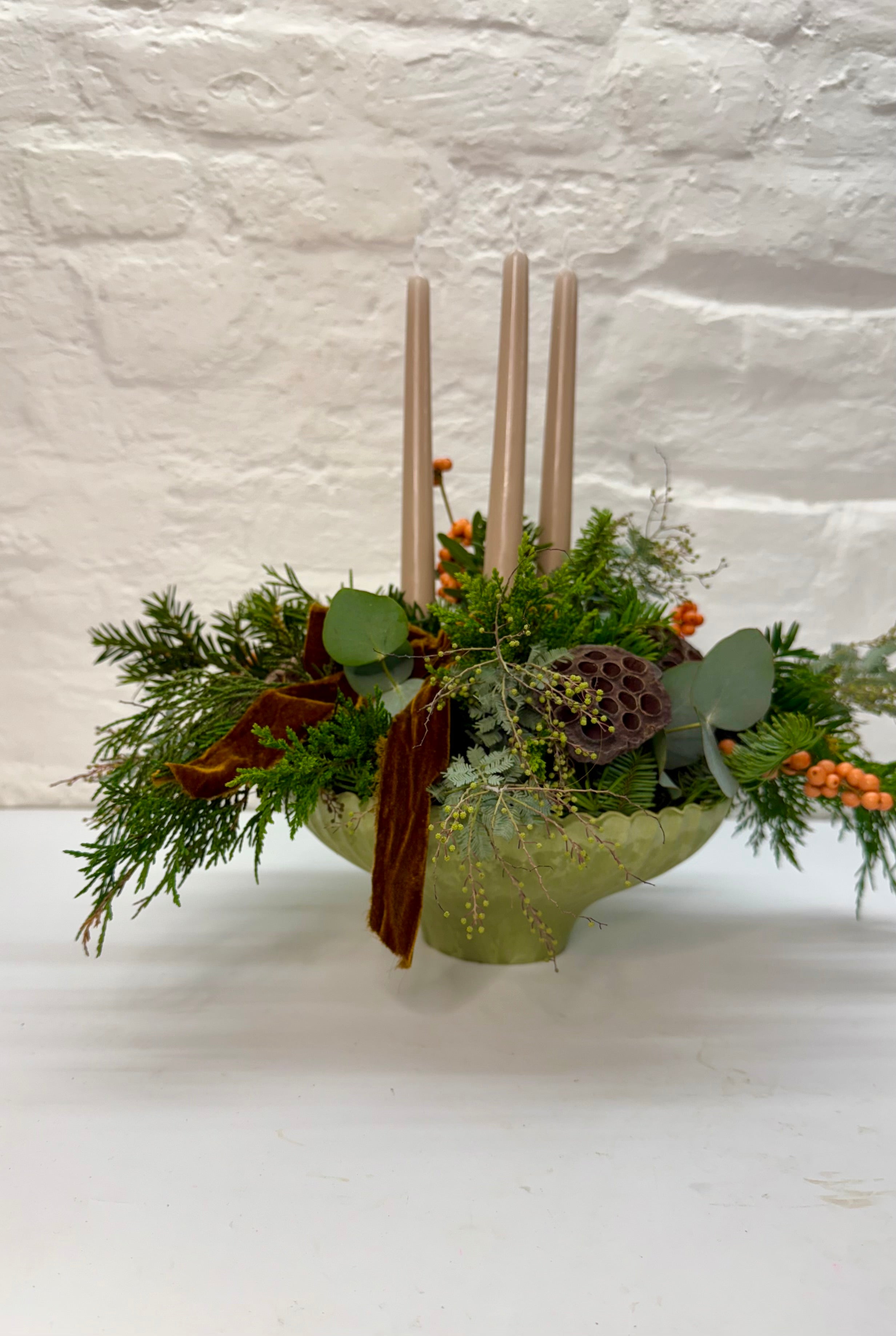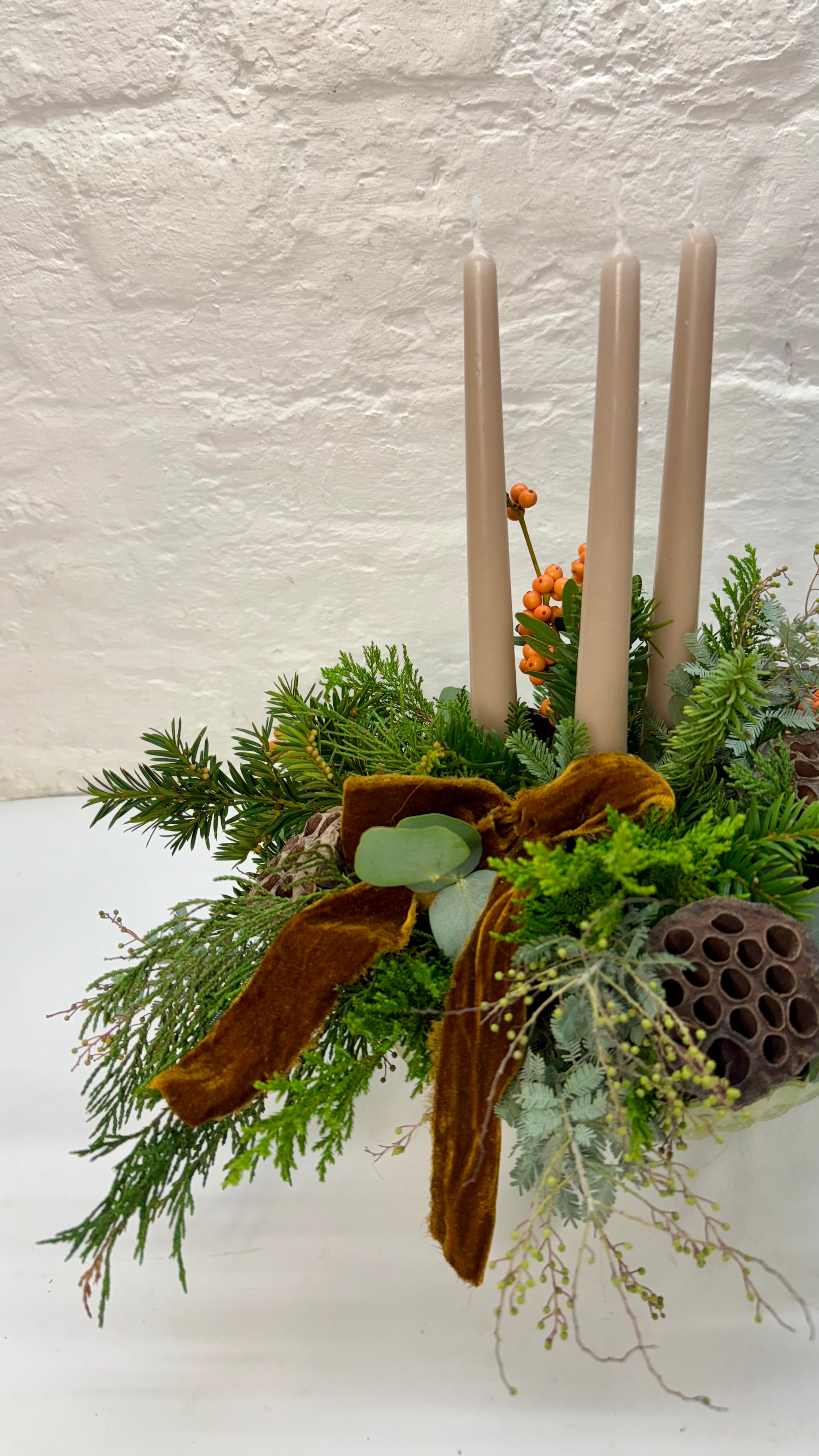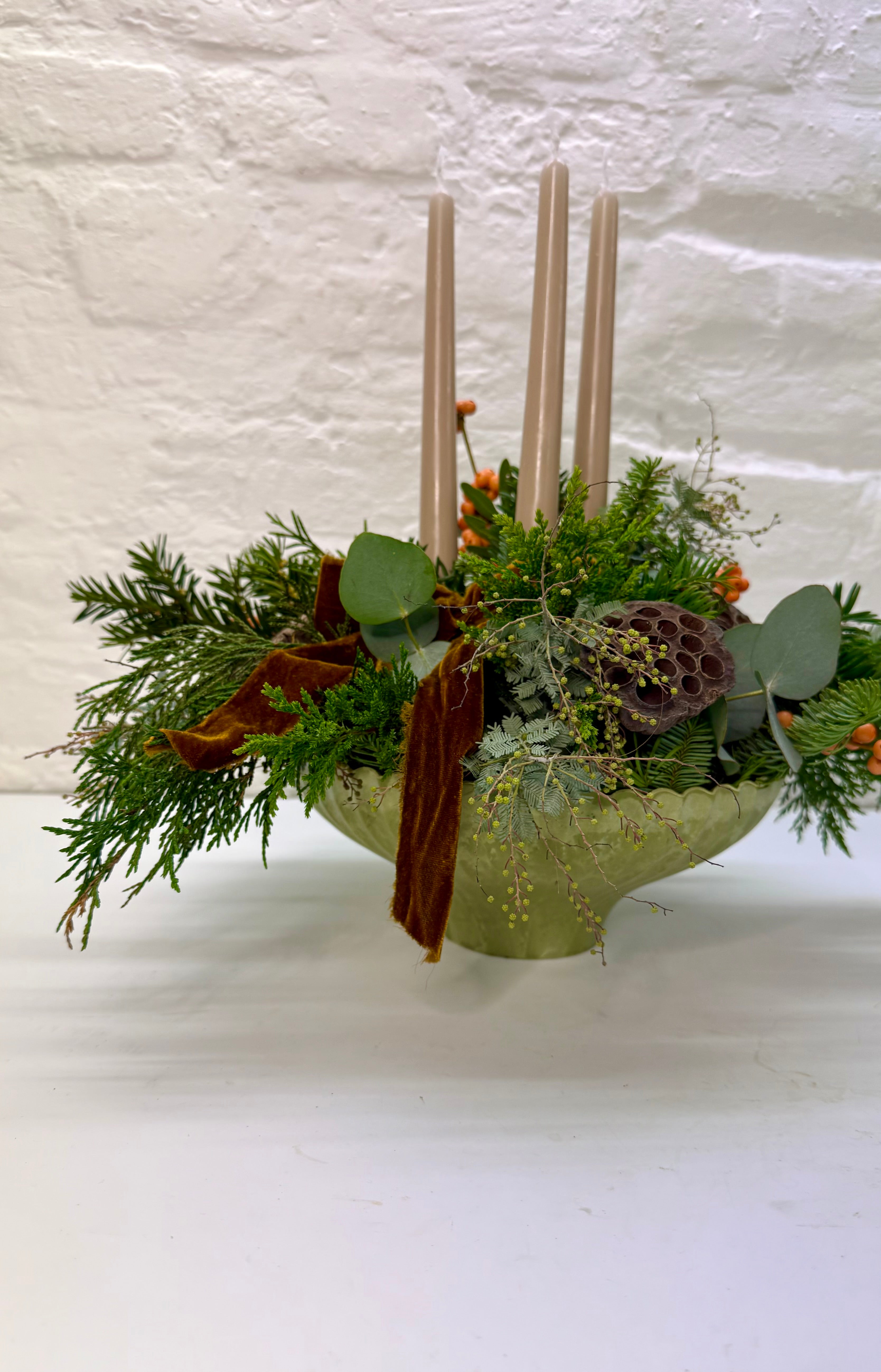 Peach Ilex & Mixed Foliage Christmas Table Arrangement with Luxury Velvet Bow