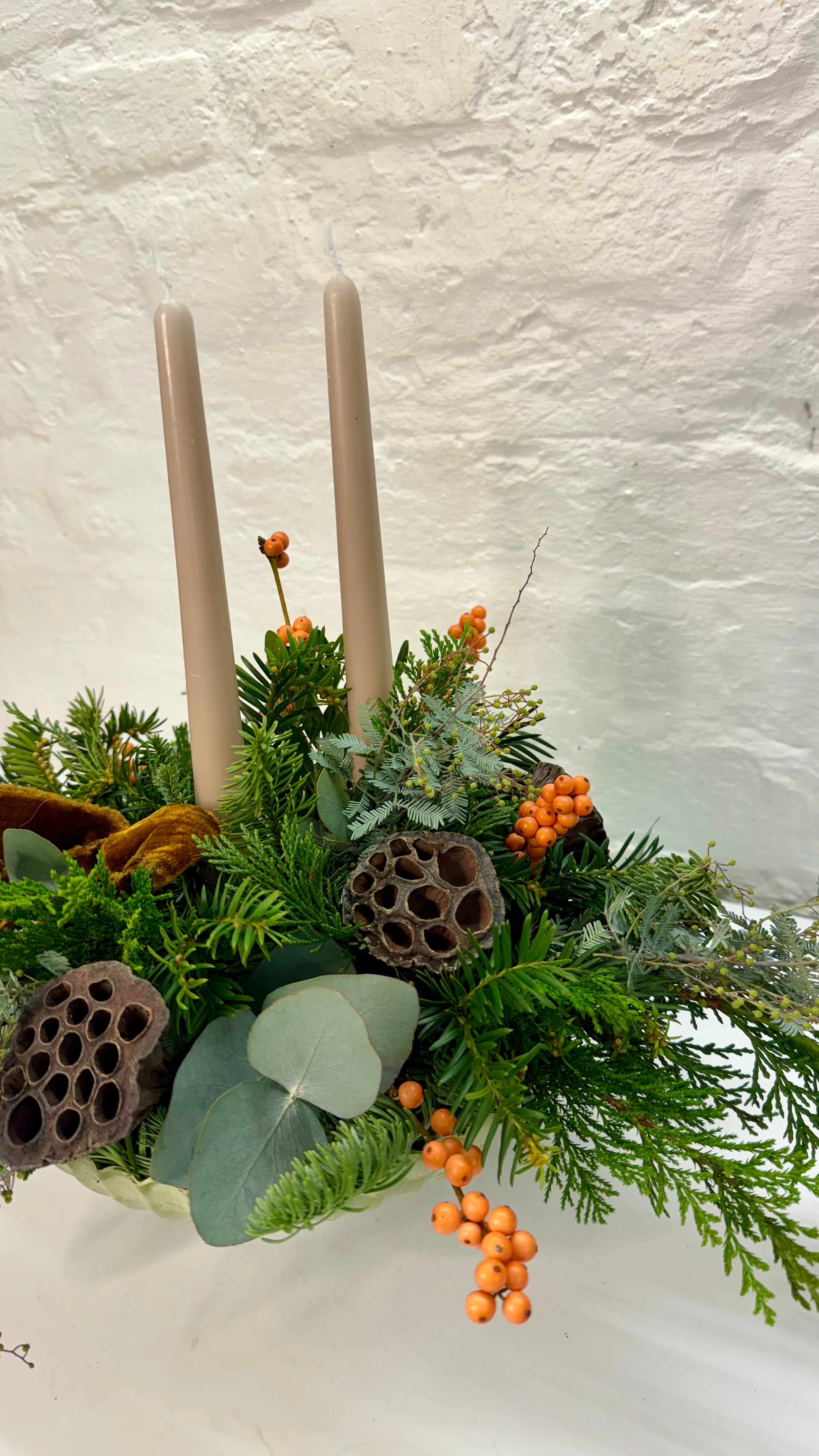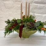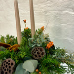 Elevate your festive décor with this elegant Christmas table arrangement, featuring a rich mix of seasonal foliage highlighted by delicate peach ilex berries. Thoughtfully designed to bring warmth and sophistication to your home, this arrangement combines natural winter textures with soft festive tones for a truly refined look.