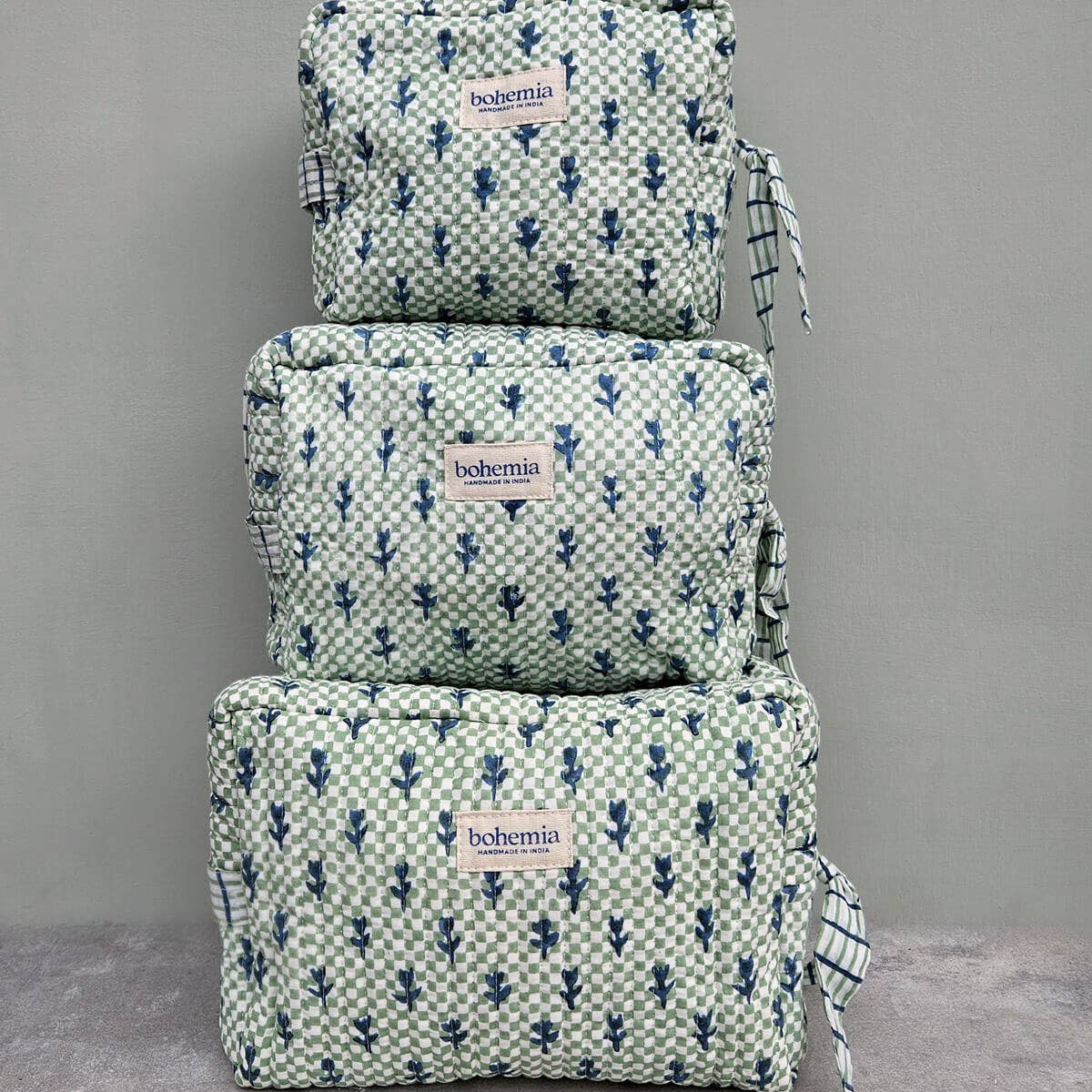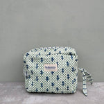 A delightfully quirky hand block print inspired by cottage gardens and their blooming borders, the Tulip Wash Bag features a sweet combination of tulips on graphic check in blue and sage green. Contrast details such as the handle, piping and bow are picked out in a fine, linear check. A great favourite with stockists around the world, our best selling quilted cotton wash bags have a waterproof lining with 3 interior pockets, a useful carry handle and metal zip graced with handcrafted bow. These wash bags are as practical as they are charming - perfect as travel companions, daily cosmetic bags, or colourful additions to any bathroom. With their playful design, they brighten in-store displays and make beautiful, thoughtful gifts. Ethically Handmade in India Cotton Block Print | Waterproof Lining Cool Hand wash 3 Interior Pockets.