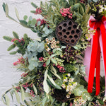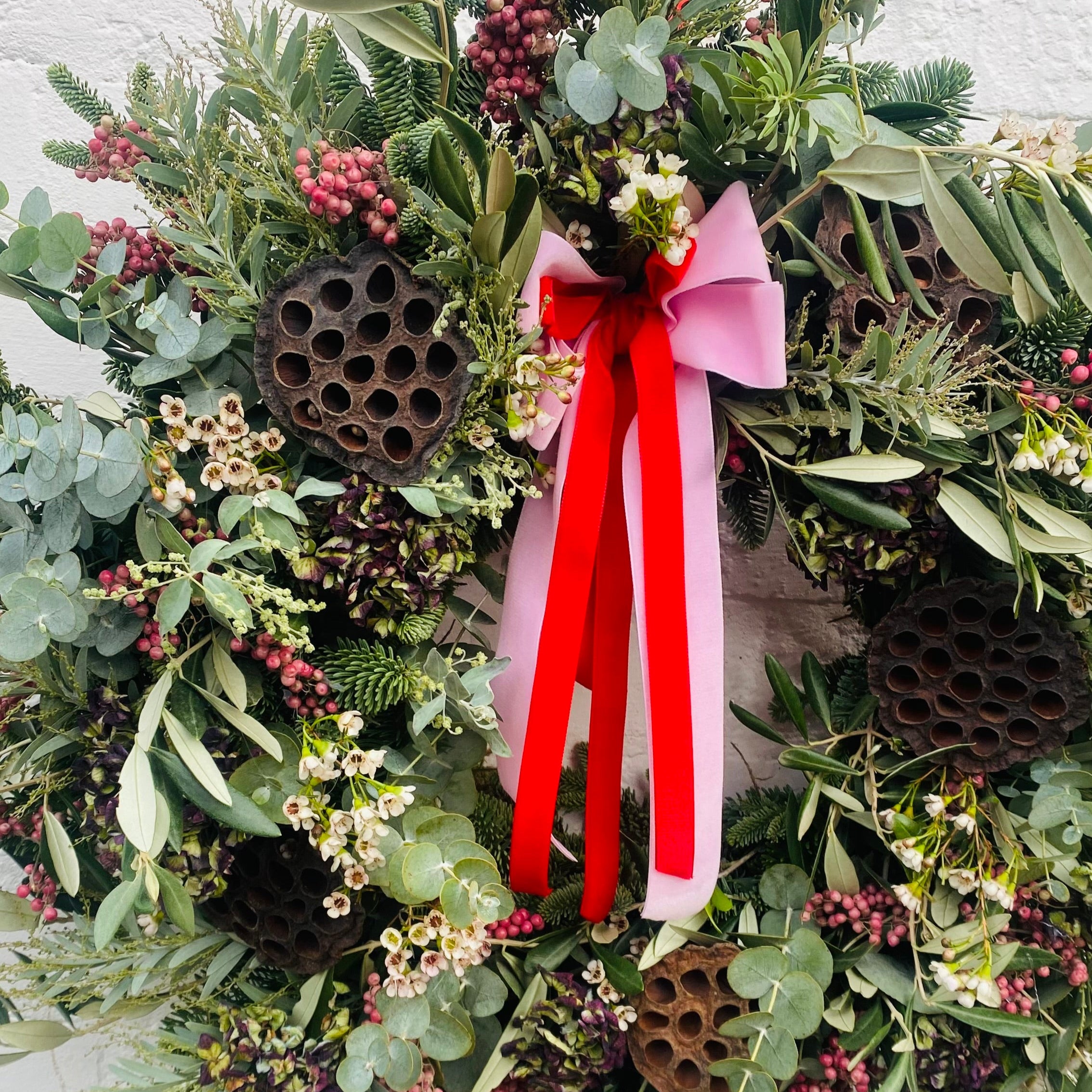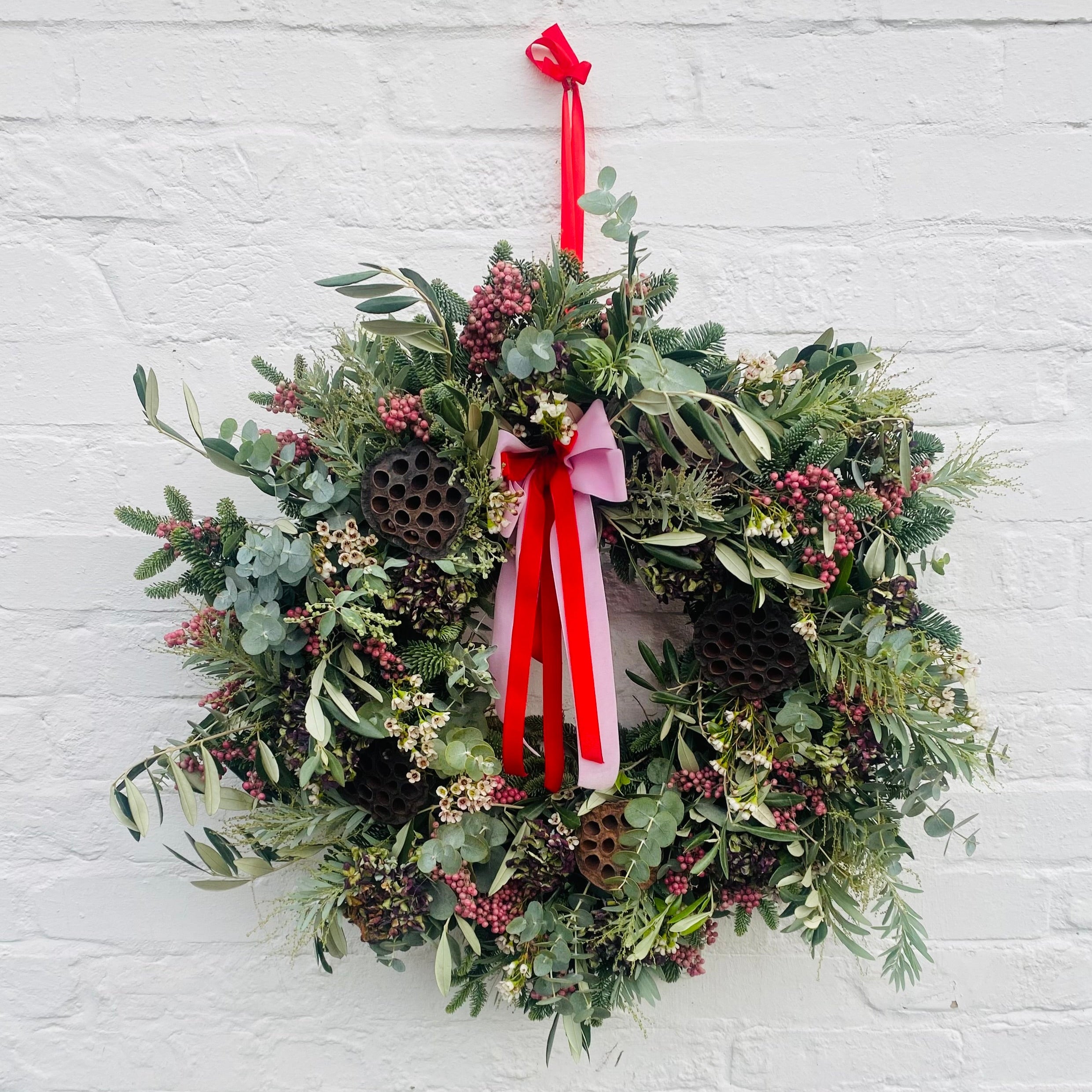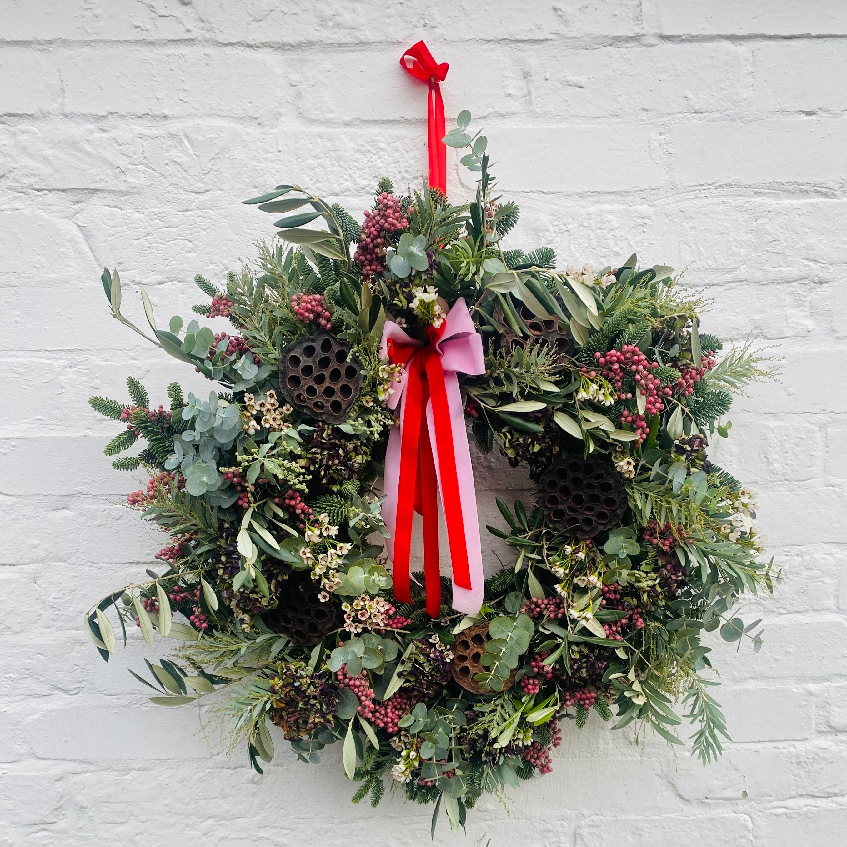 Premium Materials: We source the finest winter greeneries, berried foliage, traditional English festive greenery, decorative items, high quality ribbons, dried flowers and natural decorations. Ensuring your wreath is a true work of art that will last from the end of November to January.